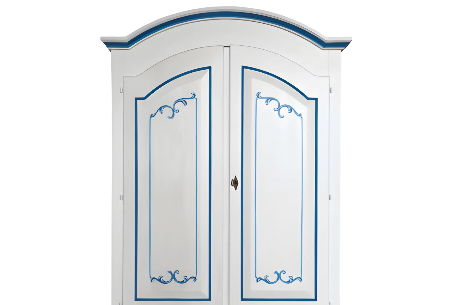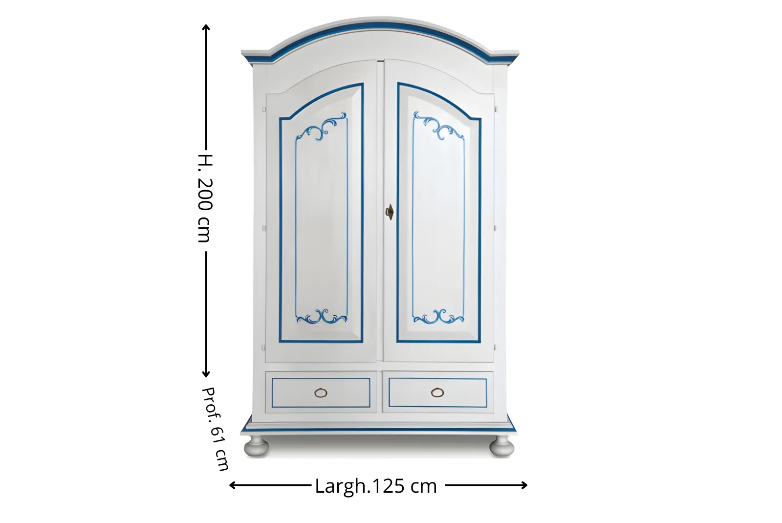 La finitura laccata bianca conferisce un aspetto luminoso e moderno, perfetto per adattarsi a diversi stili di arredamento, dal classico al contemporaneo. I filetti blu aggiungono un tocco di colore e raffinatezza, creando un contrasto delicato ma d’impatto. Questo armadio non solo arricchisce l’estetica dell’ambiente, ma garantisce anche praticità e ordine.