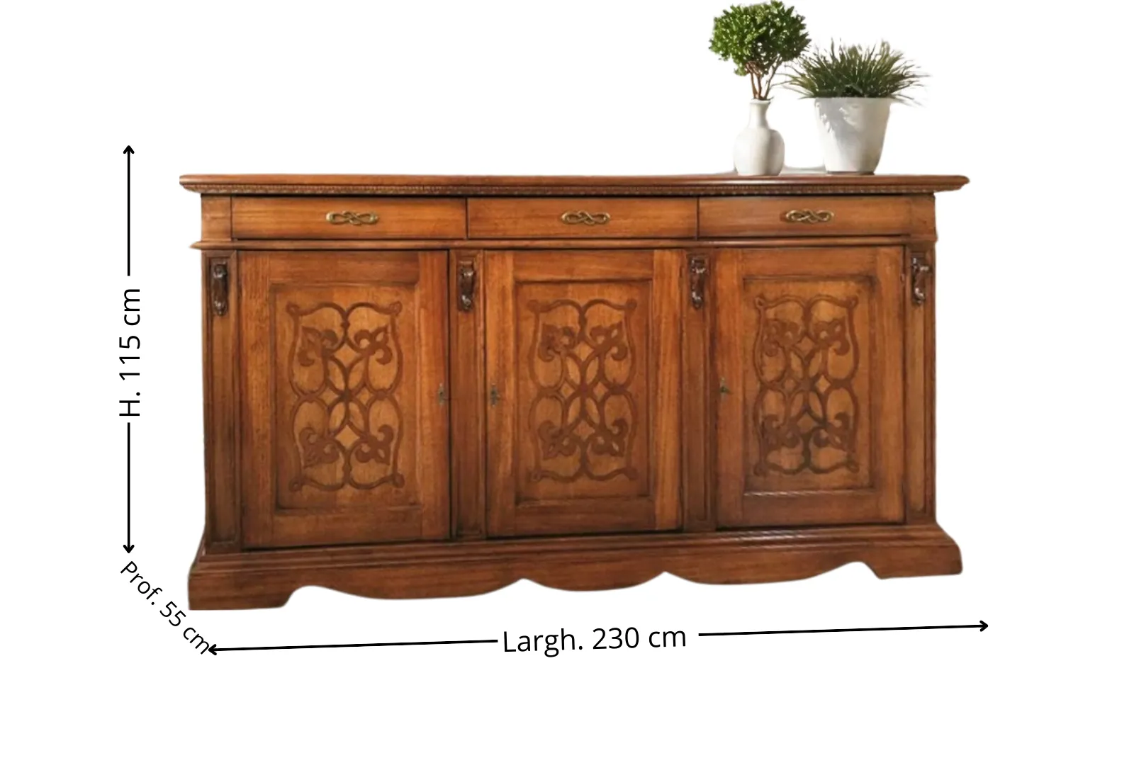 | Dimensioni Credenza | Larghezza 230 – Profondità 55 – Altezza 115 cm |