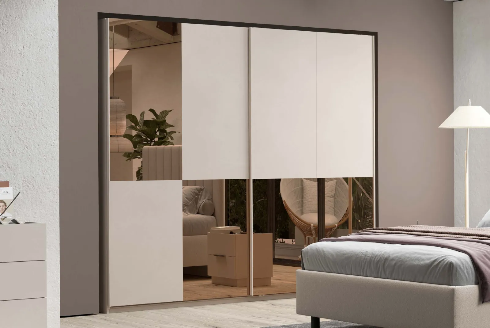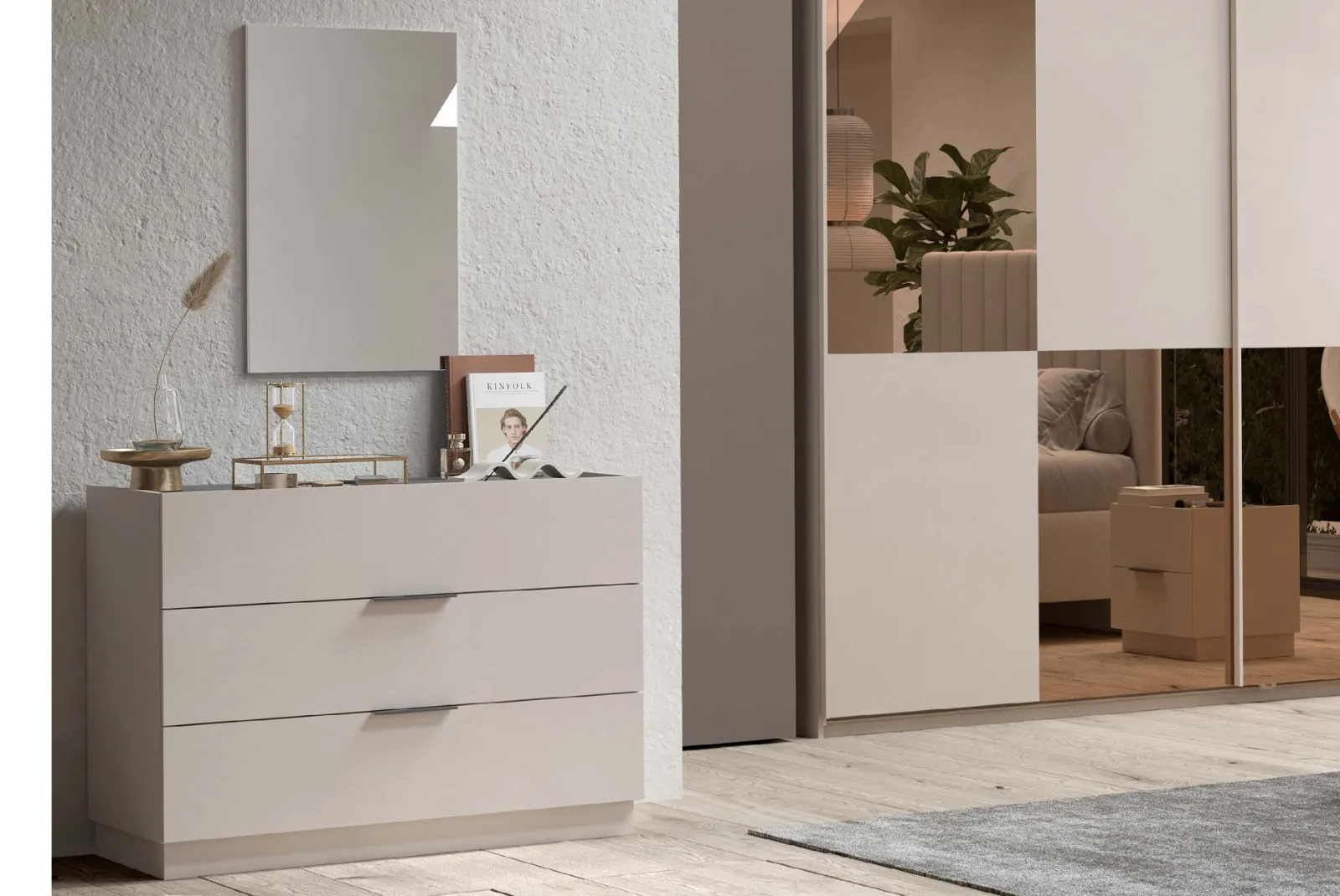 - Struttura e Finitura: Cachemire e specchi bronzati