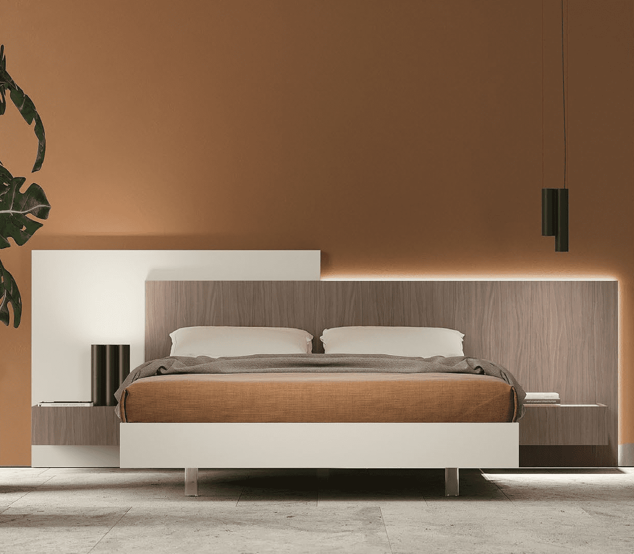 - 01 Letto: Spazio con comodini integrati e luci led – nobilitato grigio e noce