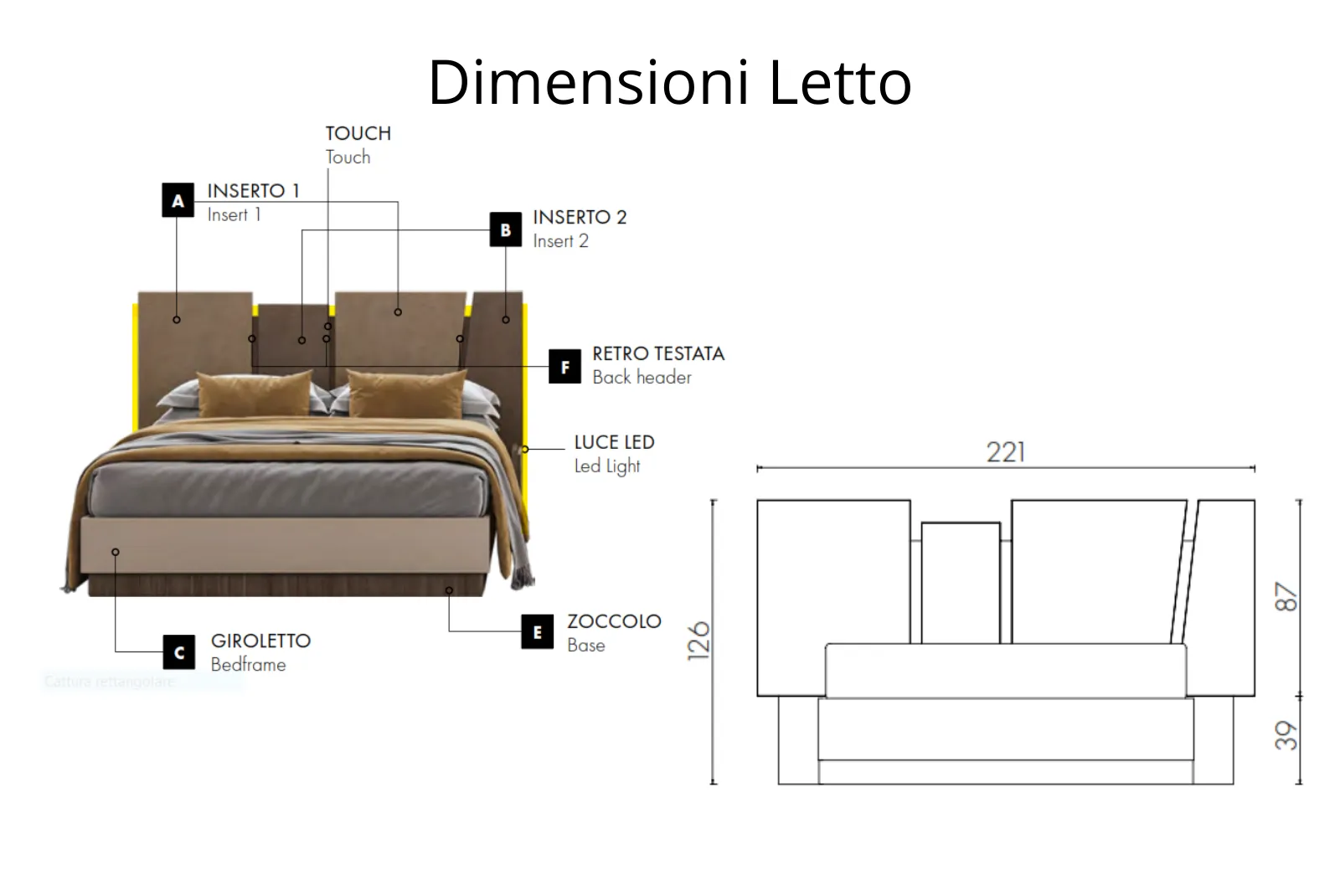 - Letto: L.220 – Prof.206 – H.127 – rete ortopedica inclusa L.160 x prof. 195 cm