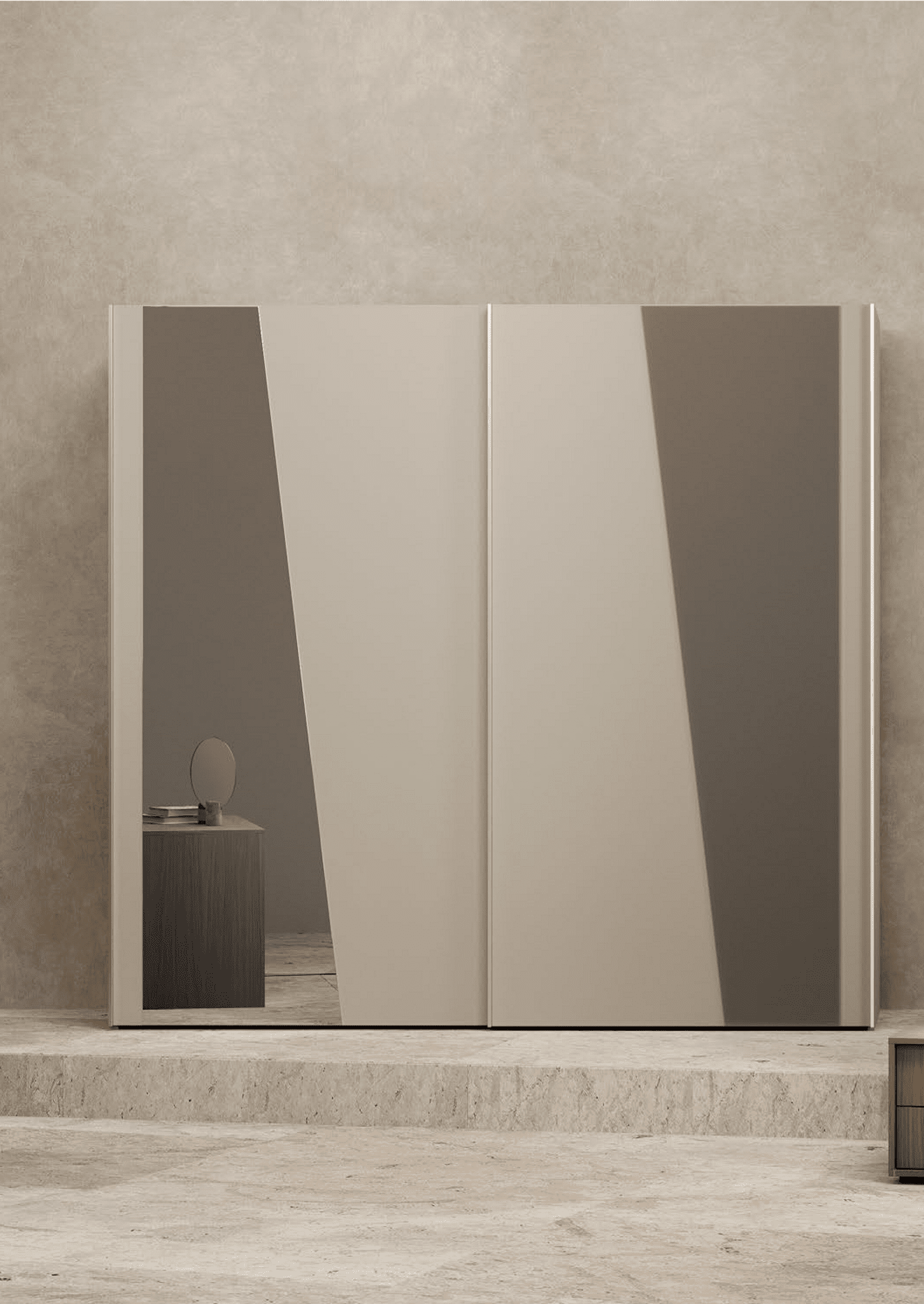 - Struttura: Nobilitato grigio e specchio fumé con maniglioni laccati in tinta grigio , fianchi sp 25 mm e chiusura ammortizzata