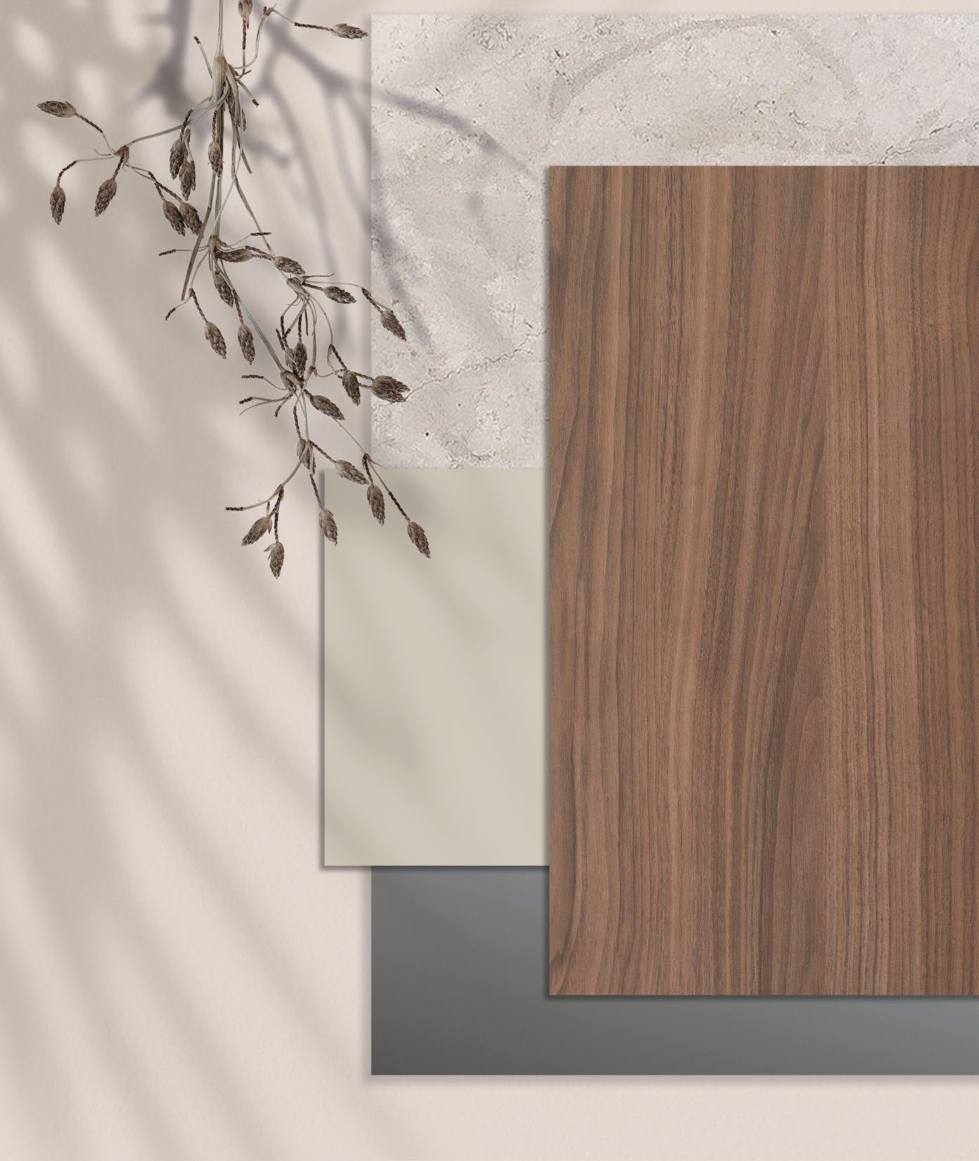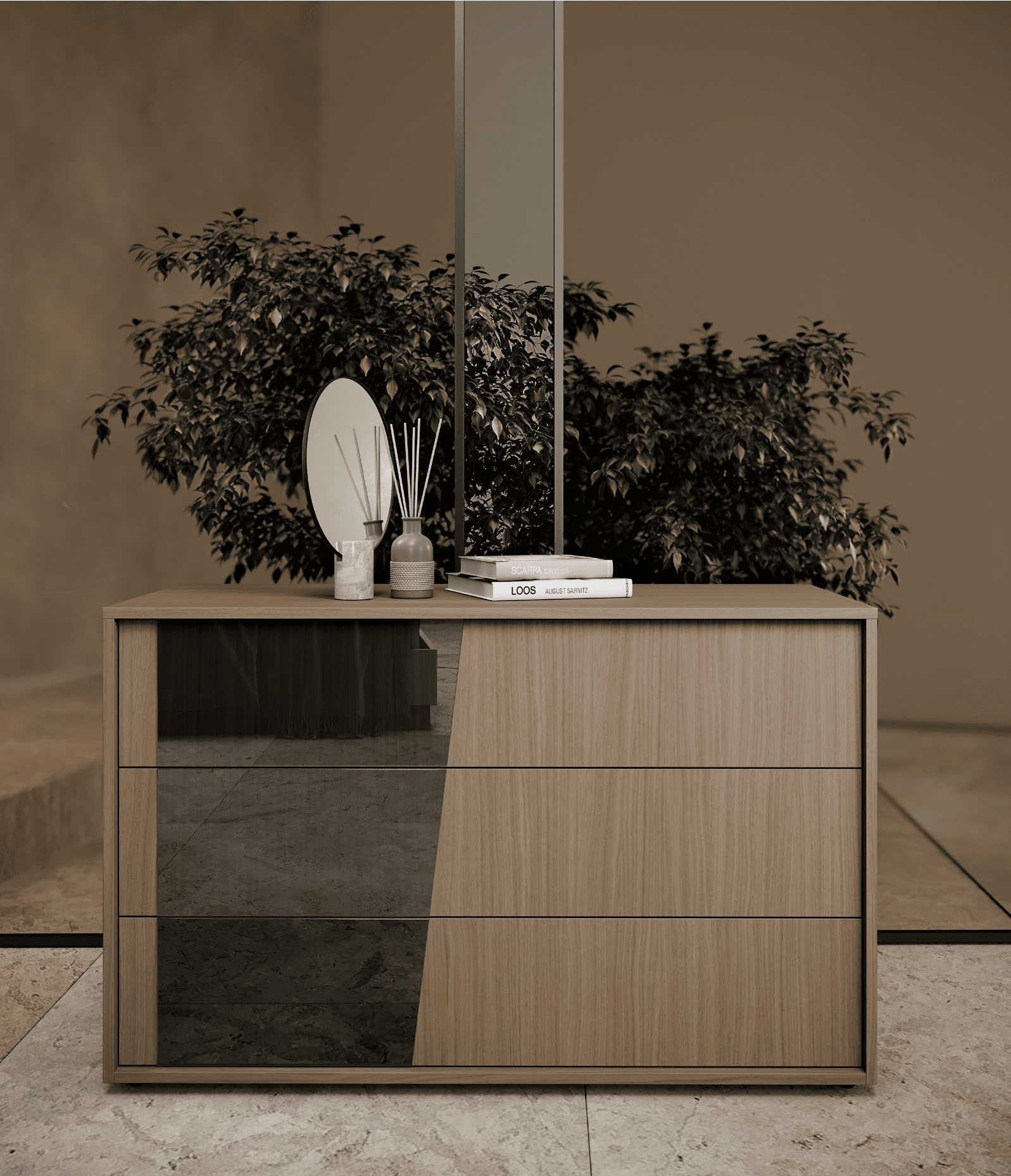- 01 Comò: Tango – nobilitato noce e maniglia specchio fumé