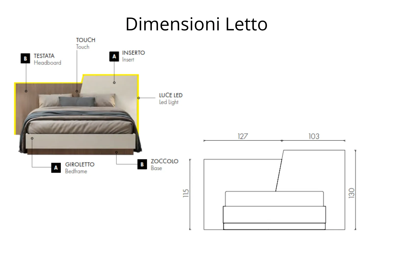 - Letto: L.230 – Prof.206 – H.115/132 cm – rete ortopedica inclusa L.160 x prof.195 cm