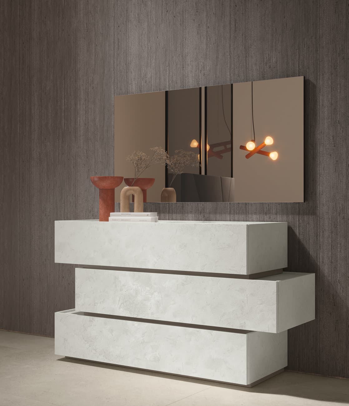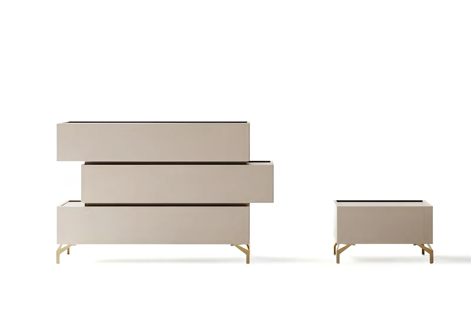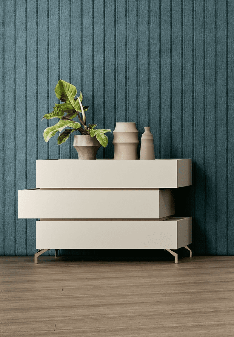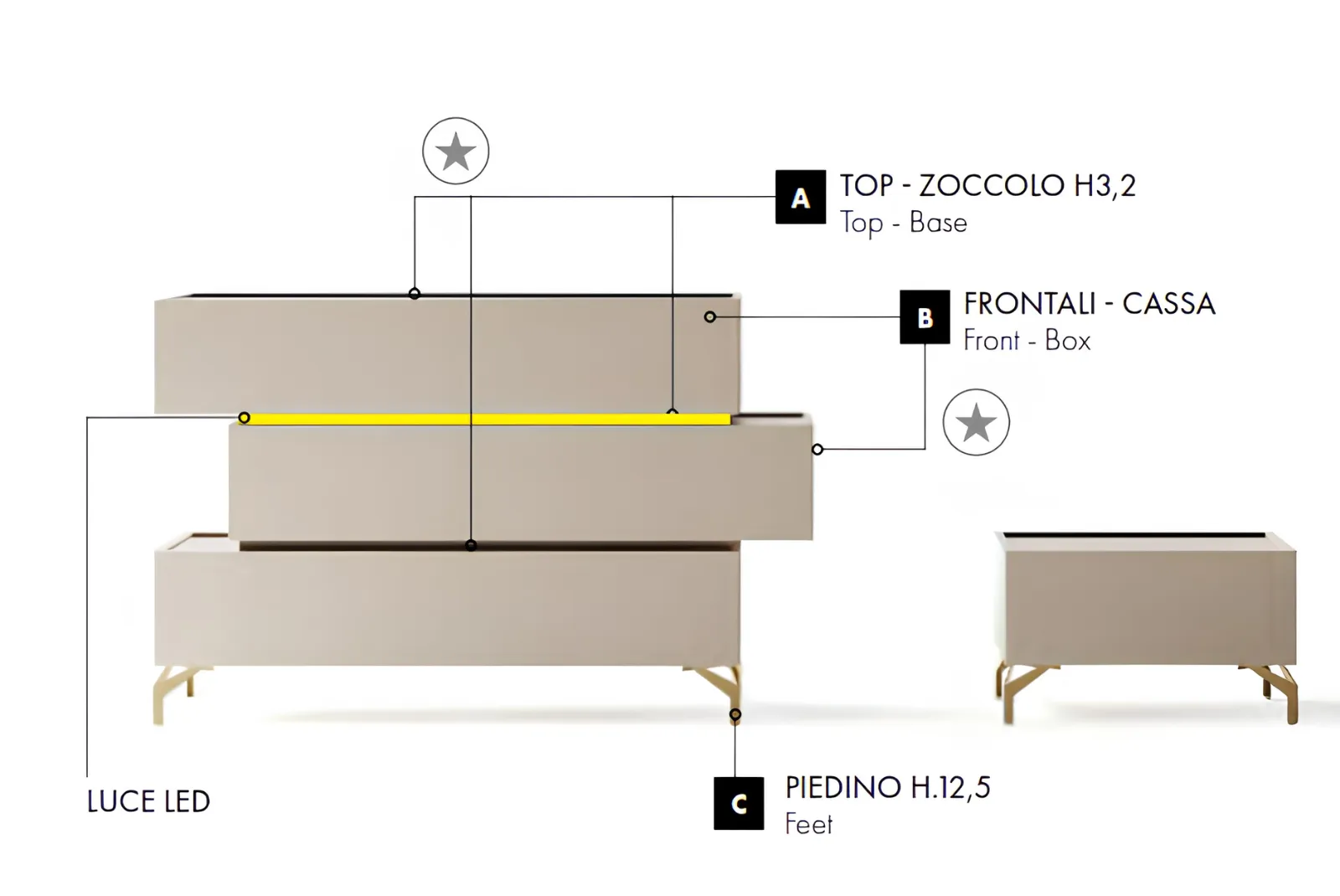 - 01 Comò: Up – nobilitato grigio e piedini champagne