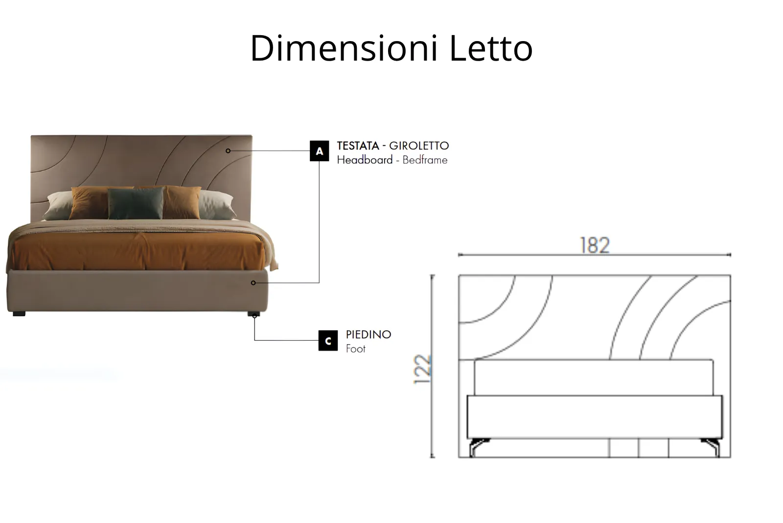 - Letto: L.182 – Prof.210 x H.122 cm – rete ortopedica inclusa L.160 x prof. 195 cm