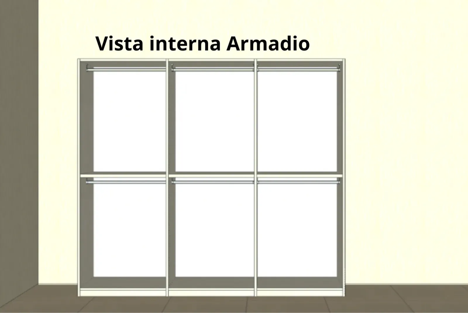 - Armadio 6 ante battenti: Larghezza 269 – Profondità 60 – Altezza 248 cm