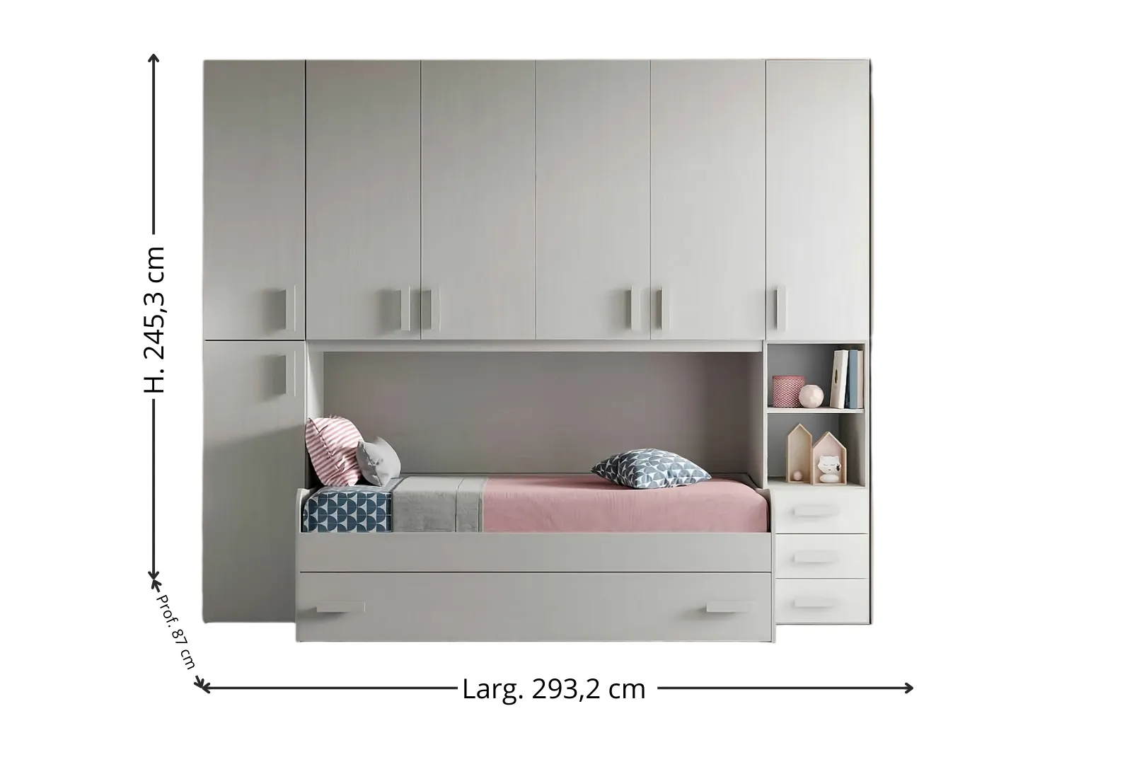 | Dimensioni Cameretta Blair | Larghezza 293,2 – Profondità 56,8 / 87 – Altezza 245,3 cm |