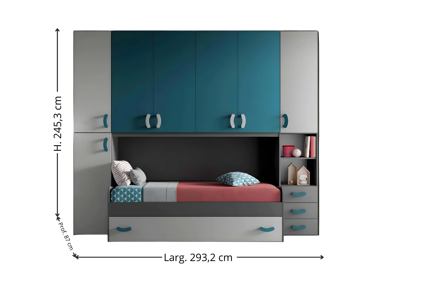 - Dimensioni: Larghezza 293,2 – Profondità 56,8 / 87 – Altezza 245,3 cm