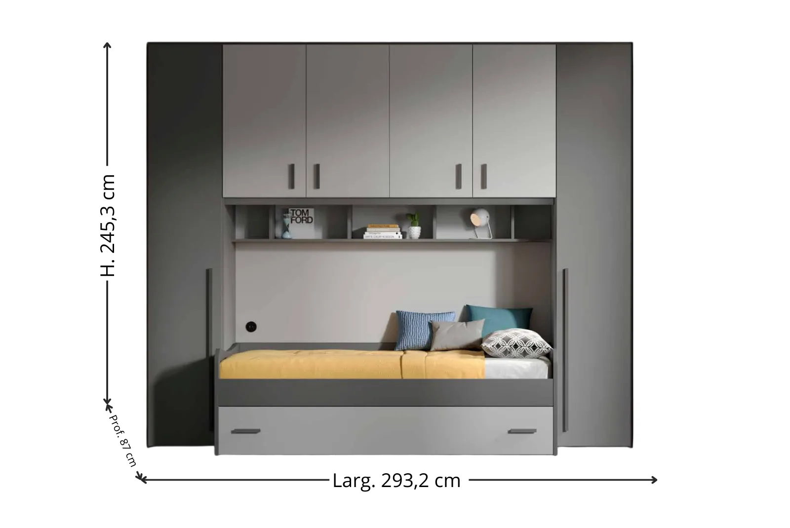 - Dimensioni: L. 293,2 – Prof. 56,8 / 87 – H. 245,3 cm