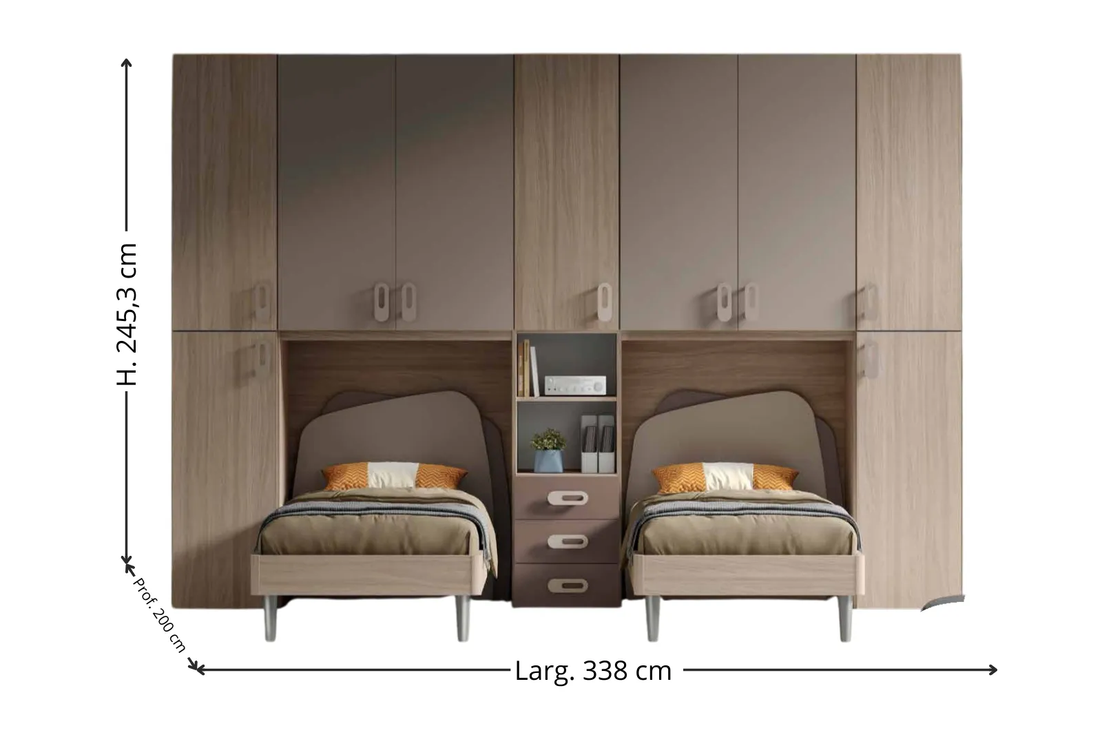 - Dimensioni: Larghezza 338 – Profondità 56,8 / 200 – Altezza 245,3 cm