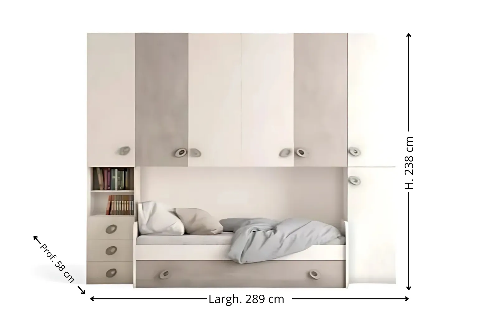 Struttura bianco frassinato da 18 mm. Frontali Calce Bianco e Cemento da 18 mm. Letto da 22 mm – Rete superiore a doghe, Rete inferiore a maglia.