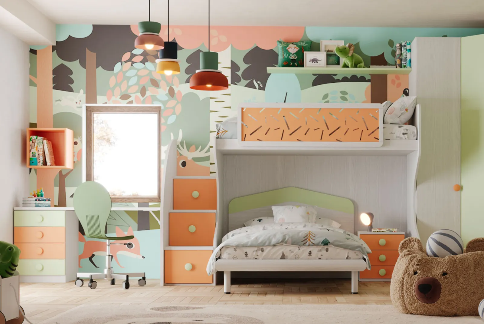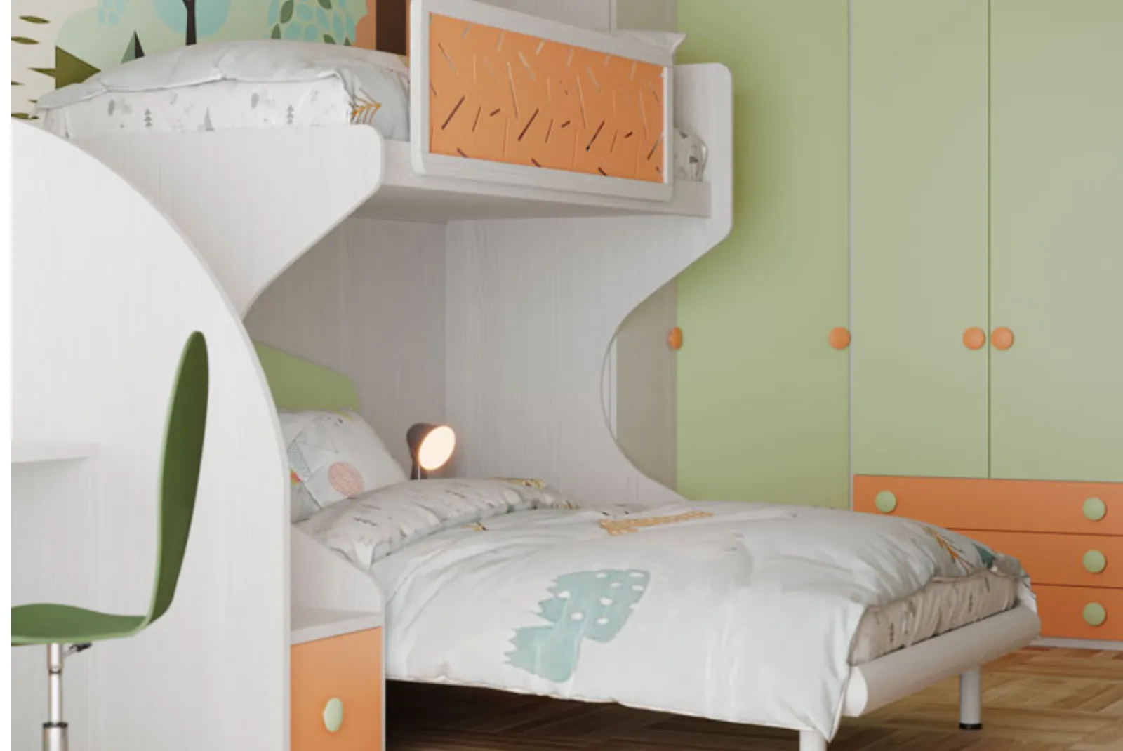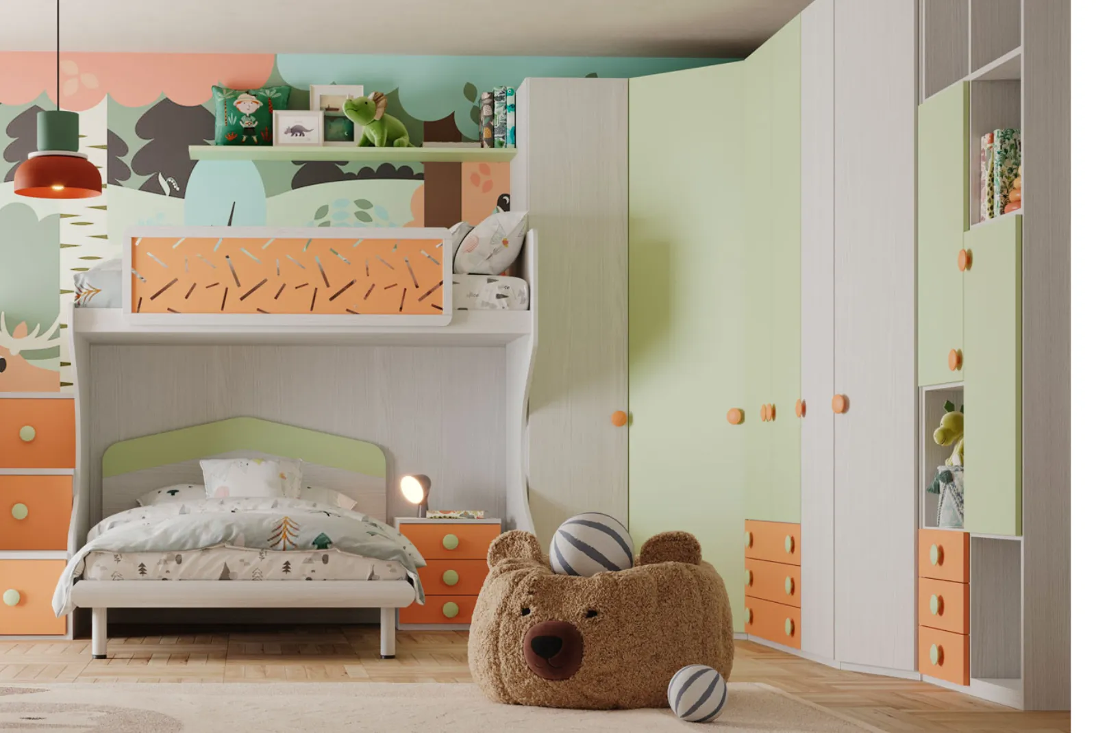 Scopri la cameretta Fly composizione 350 con armadio battente ad angolo, letto a castello con gradini e scrivania. Una cameretta d’arredo versatile e confortevole che dona un tocco di eleganza a qualsiasi ambiente.