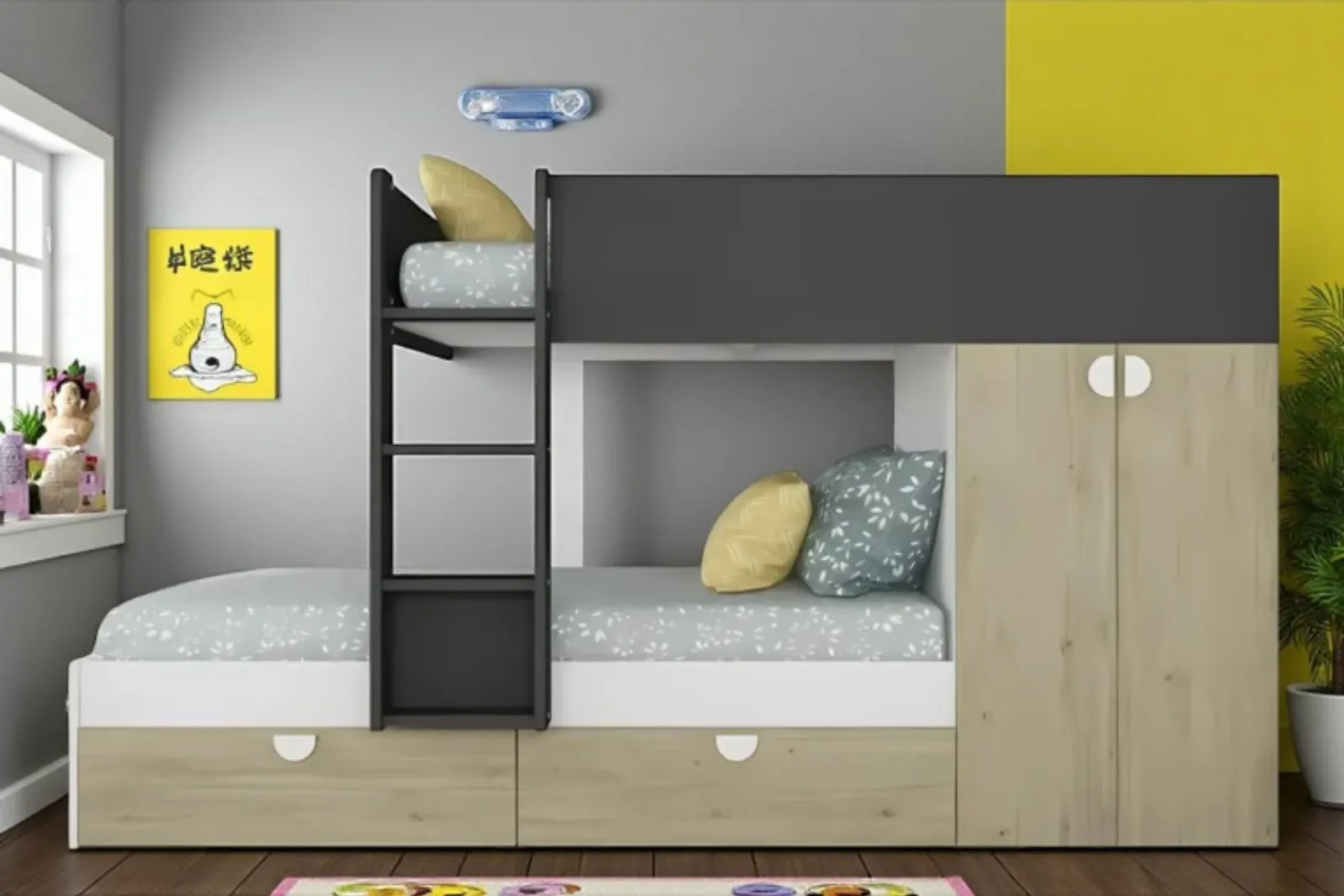 Una cameretta con un letto a castello dotato di cassettoni in antracite rappresenta una soluzione pratica e moderna per ottimizzare lo spazio in una stanza, soprattutto se condivisa da più bambini o ragazzi.