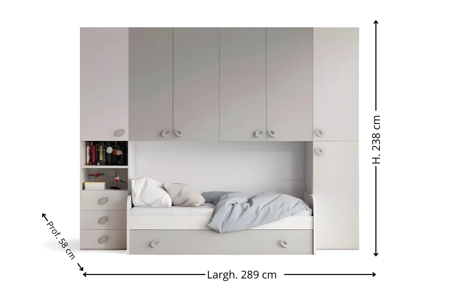 Struttura bianco frassinato da 18 mm. Frontali Bianco Frassino e Grigio da 18 mm. Letto da 22 mm – Rete superiore a doghe, Rete inferiore a maglia.