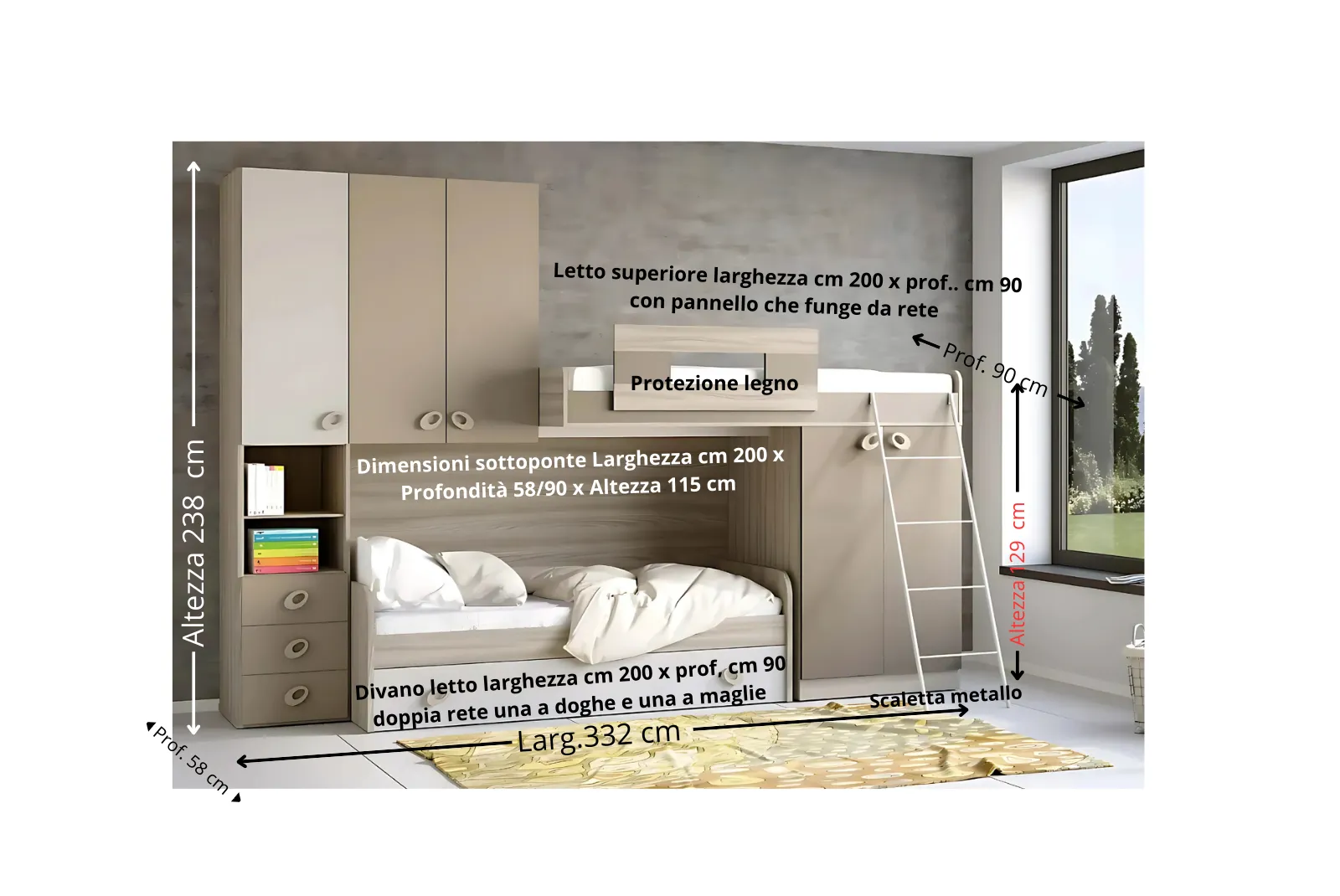 - Dimensioni: Larghezza 332 cm x Profondità 58/90 – Altezza 238 cm