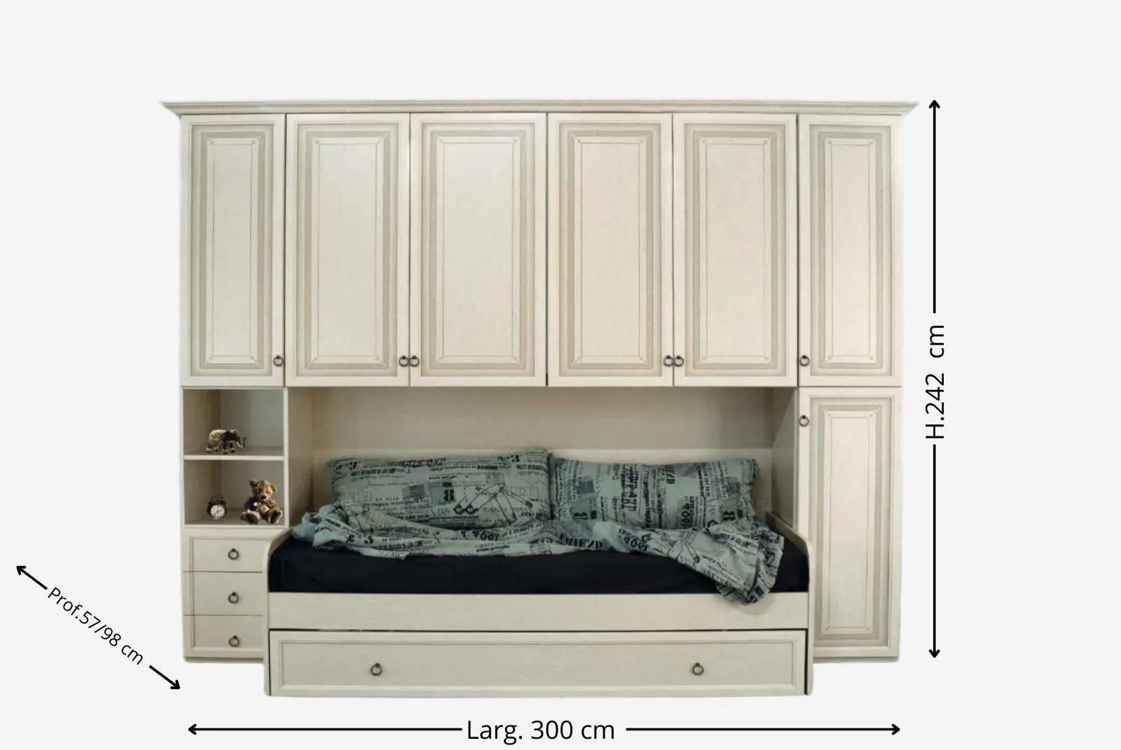 - Dimensioni: Larghezza 300 – Profondità 57/98 – Altezza 242 cm