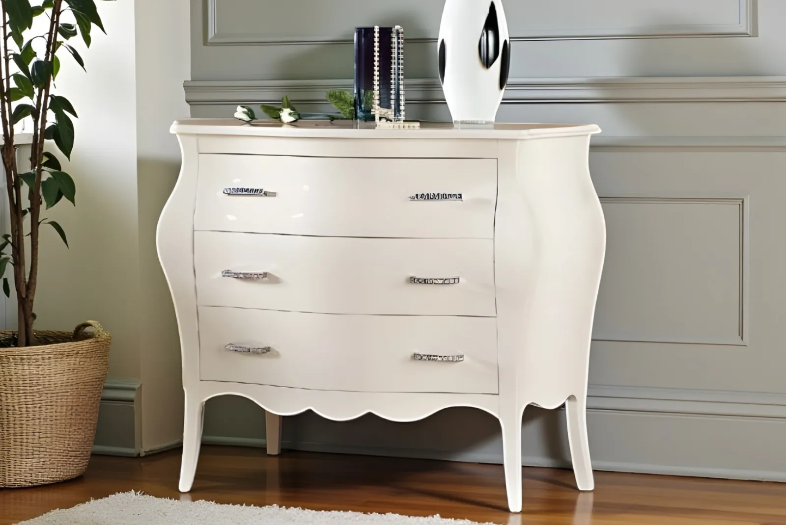 Clicca qui per ulteriori informazioni!Lasciati avvolgere dal fascino senza tempo dello stile Arte Povera con il Comò bombato 3cassetti Bianco brillante Swarovski . Realizzati in legno massello, questi mobili sono caratterizzati da linee semplici e lavorazioni artigianali.
