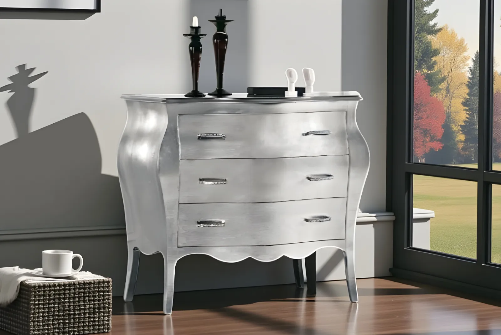 Lasciati avvolgere dal fascino senza tempo dello stile Arte Povera con il Comò bombato 3cassetti foglia argento Swarovski. Realizzati in legno massello, questi mobili sono caratterizzati da linee semplici e lavorazioni artigianali. I cassetti spaziosi e le finiture naturali rendono questo comò perfetto per chi cerca un arredamento autentico e funzionale.