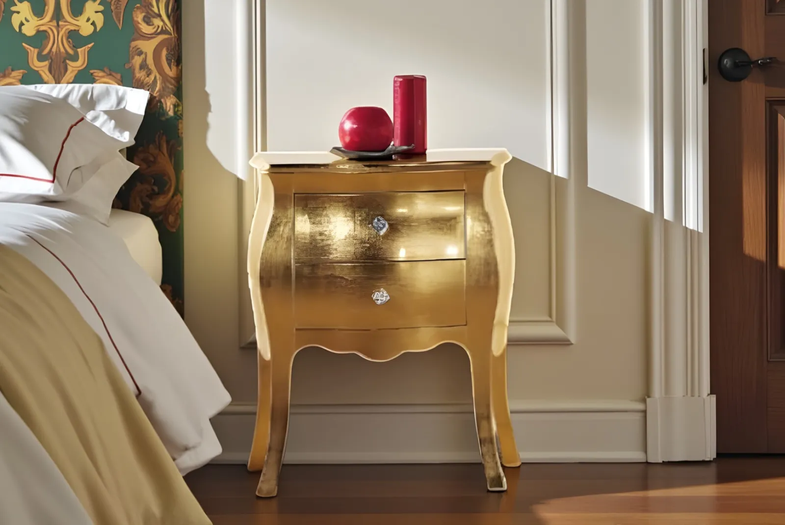 Lasciati avvolgere dal fascino senza tempo dello stile Arte Povera con il Comodino bombato 2cassetti foglia oro Swarovski . Realizzati in legno massello, questi mobili sono caratterizzati da linee semplici e lavorazioni artigianali. I cassetti spaziosi e le finiture naturali rendono questo comodino perfetto per chi cerca un arredamento autentico e funzionale.