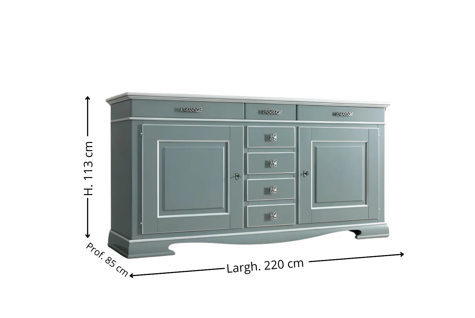 | Dimensioni Credenza | Larghezza 220 – Profondità 85 – Altezza 113 cm |