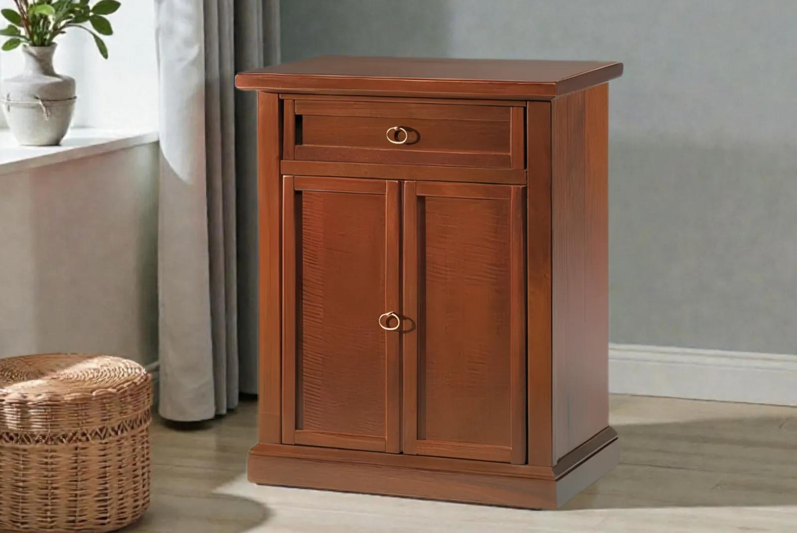 Porta la semplicità della natura nel tuo salotto con questa elegante credenzina 2 porte 1 cassetto in stile Arte Povera. Realizzata con materiali naturali e lavorata a mano.