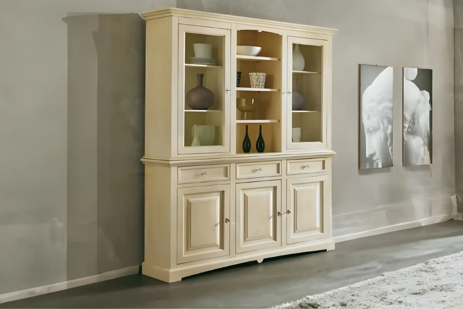 Clicca qui per ulteriori informazioni!Cristalliera 3porte 3cassetti Finitura Avorio Patinato rappresenta un complemento d’arredo elegante e funzionale si adatta perfettamente a stili d’arredo sia classici che moderni. Questo tipo di mobile è ideale per esporre servizi di piatti, bicchieri e oggetti decorativi grazie alle sue ante in vetro che permettono di mettere in risalto il contenuto.