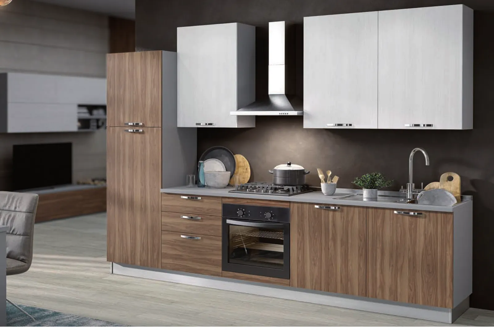 La Cucina Sara 300 Noce Pronta Consegna si distingue per il suo design attuale e moderno, con un tocco di contemporaneità dato dalle finiture in Noce e Bianco. Perfetta per arredare ogni tipo di ambiente, grazie alle sue dimensioni compatte e alla sua composizione dinamica, pratica e funzionale, la cucina Sara è la scelta ideale per chi desidera unire stile e funzionalità senza rinunciare a un’atmosfera accogliente e calda.