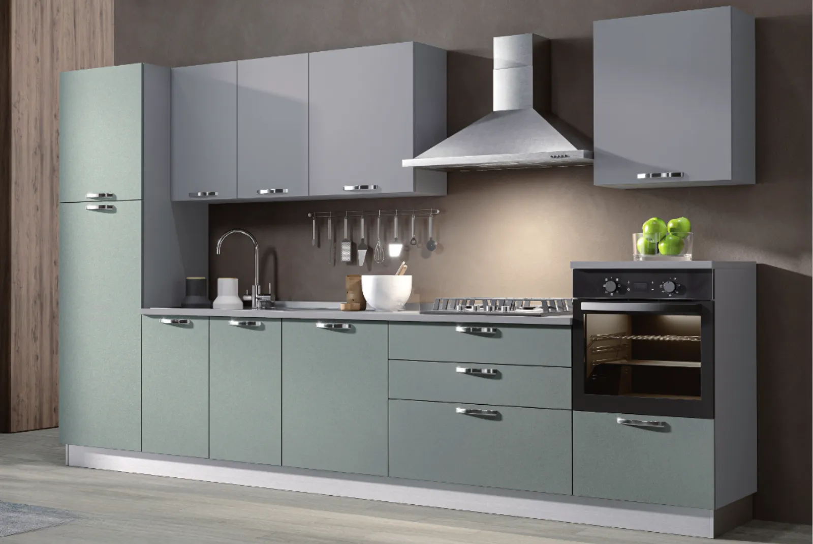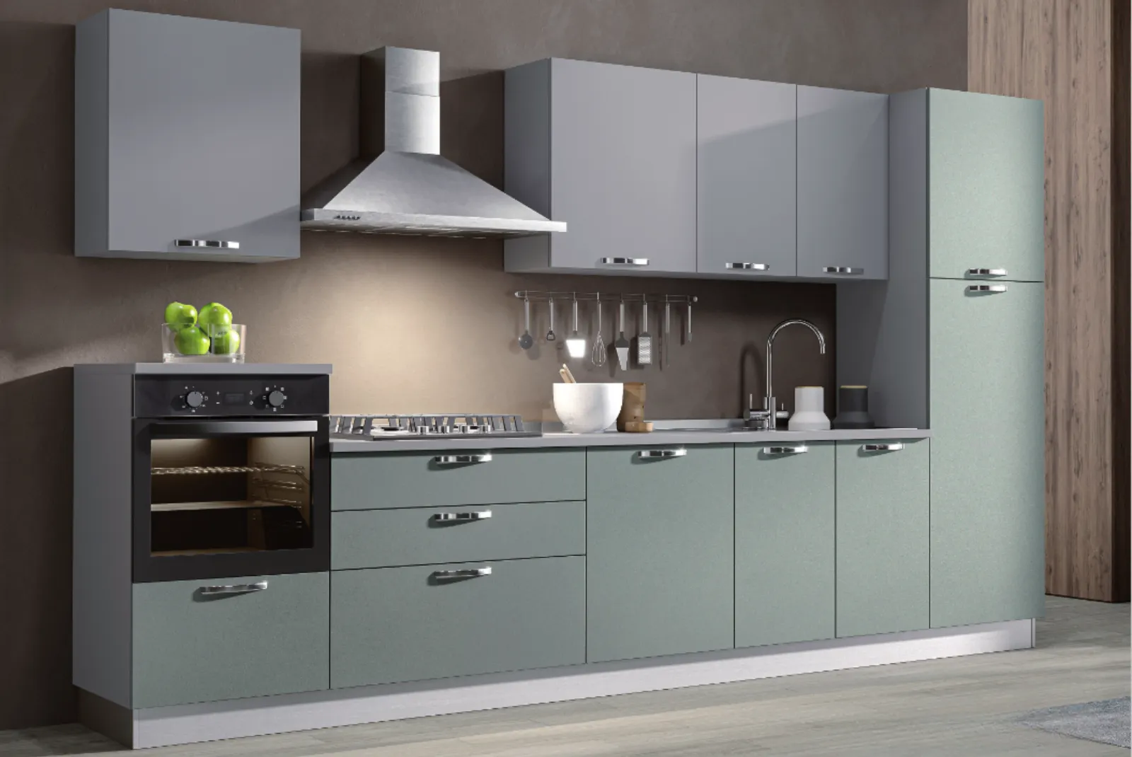 La Cucina360 Grigio Perla/Verde Salvia”Pronta Consegna” si distingue per il suo design attuale e moderno, con un tocco di contemporaneità dato dalle finiture in Grigio Perla e Verde Salvia.
