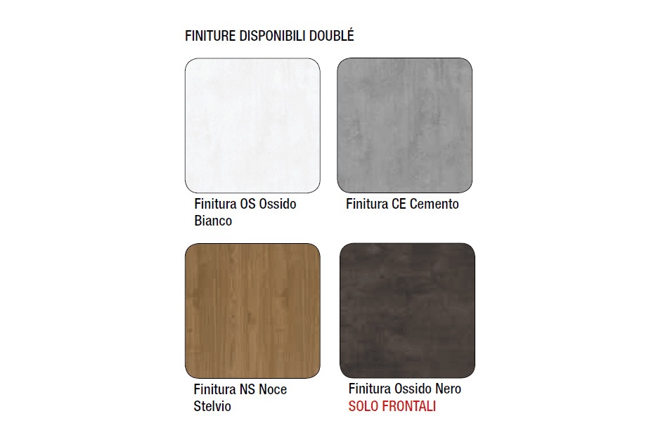 - Finiture disponibili: Finitura OS Ossido Bianco | Finitura CE Cemento | Finitura NS Noce Stelvio | Finitura Ossido Nero (solo frontali)