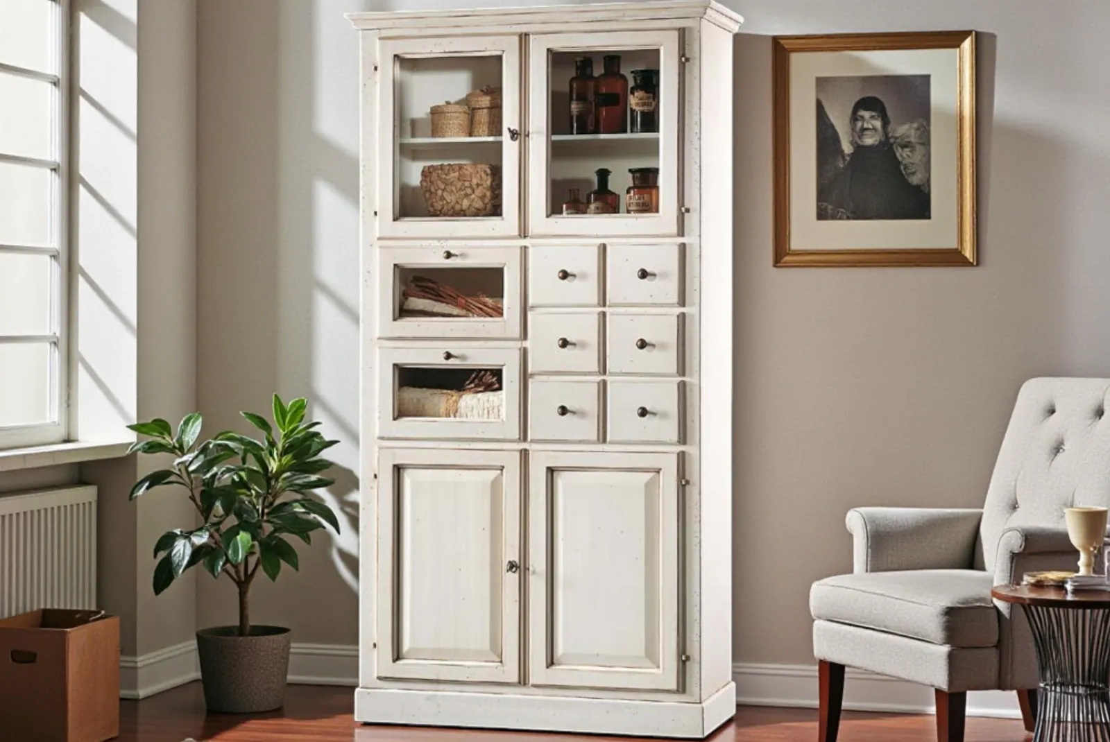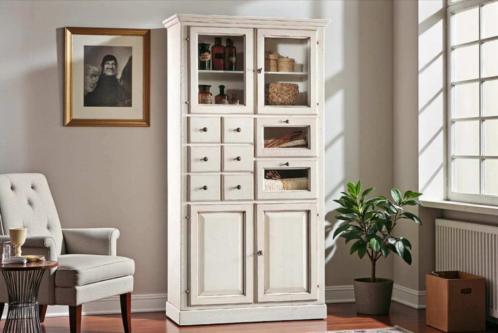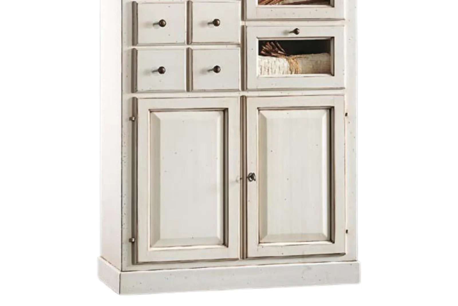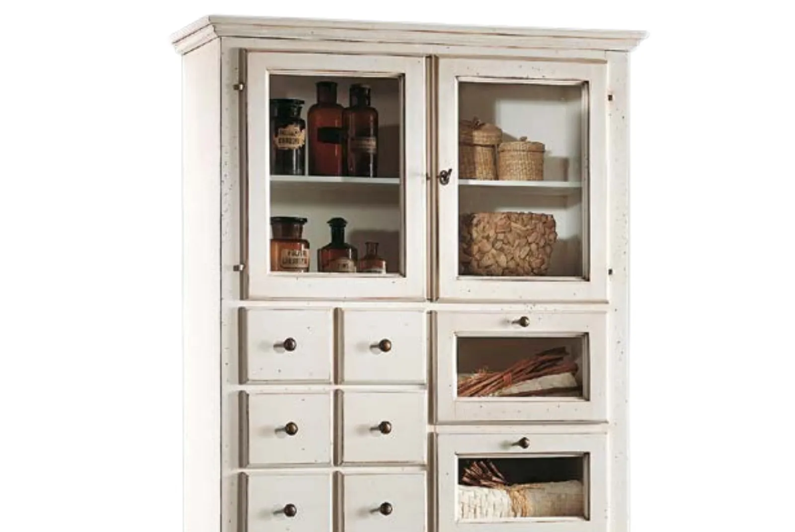 La dispensa finitura bianco patinato rappresenta un complemento d’arredo elegante e funzionale si adatta perfettamente a stili d’arredo sia classici che moderni. Questo tipo di mobile è ideale per esporre servizi di piatti, bicchieri e oggetti decorativi grazie al suo ampio spazio, permette di mettere in risalto il contenuto.