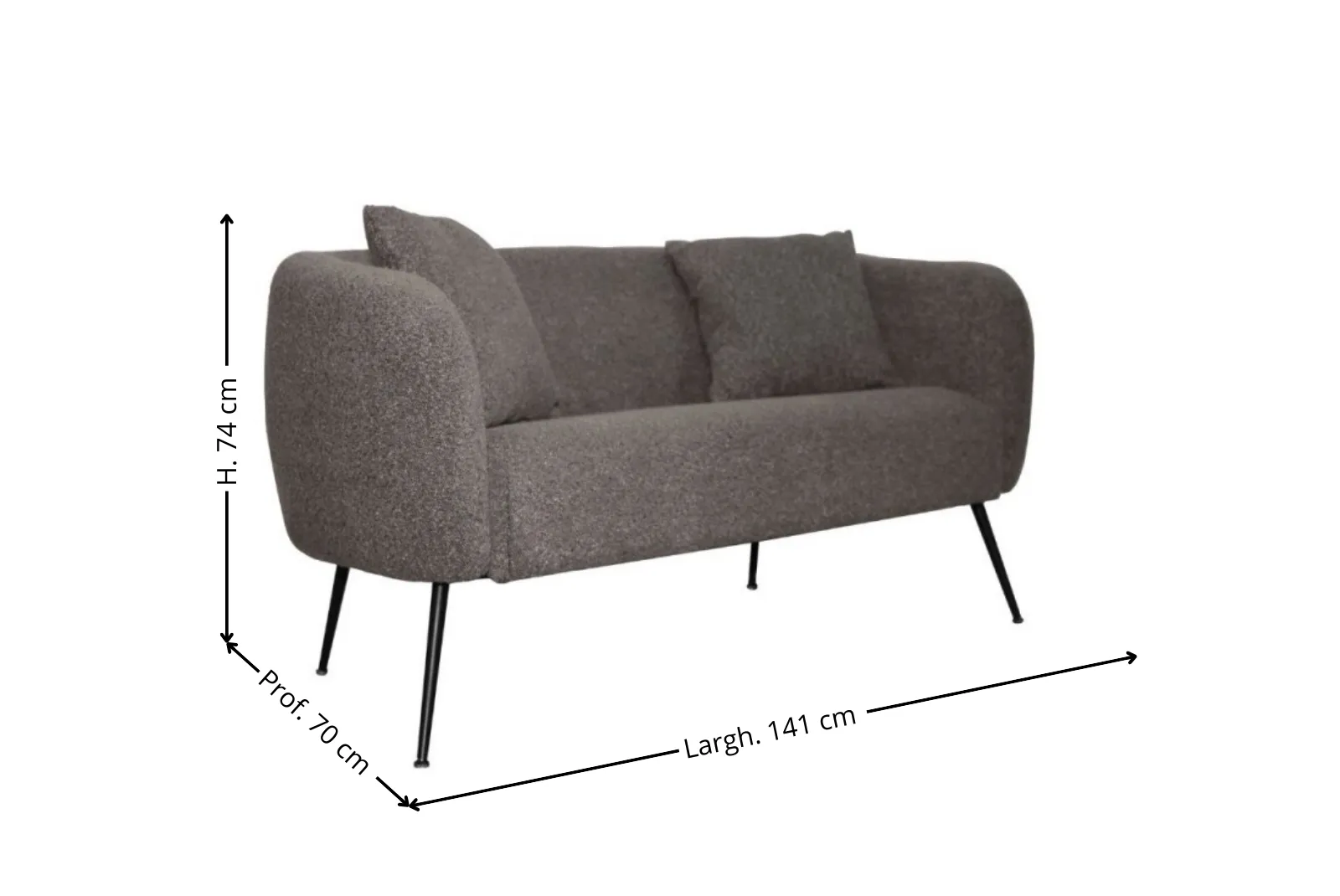 • Dimensioni: Larghezza 141 – Profondità 70 – Altezza 74 cm – H. seduta 44 – Prof. seduta 48 cm