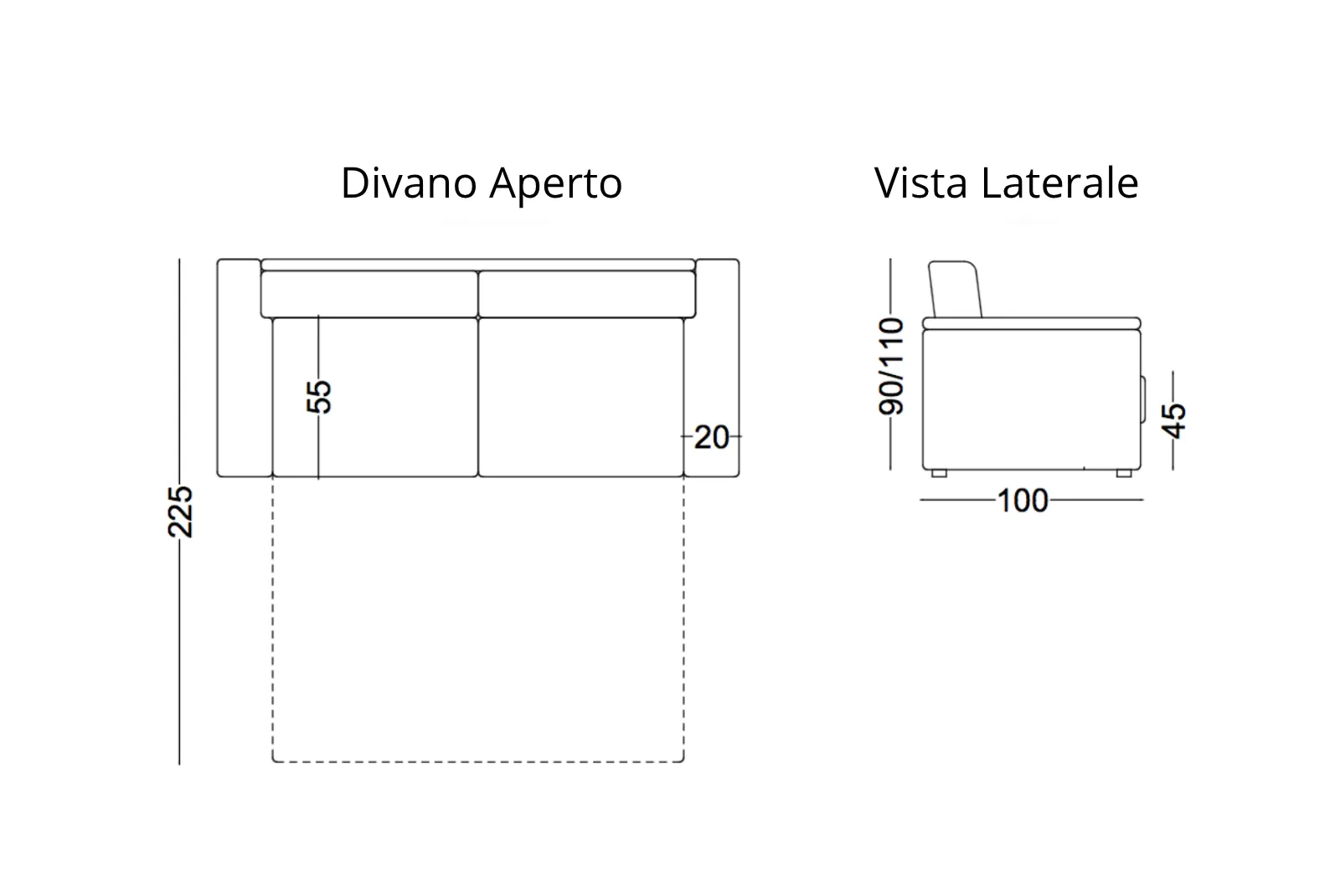 - Dimensioni aperto: L.203 – Prof.225 – H. Schienale 90/110 cm