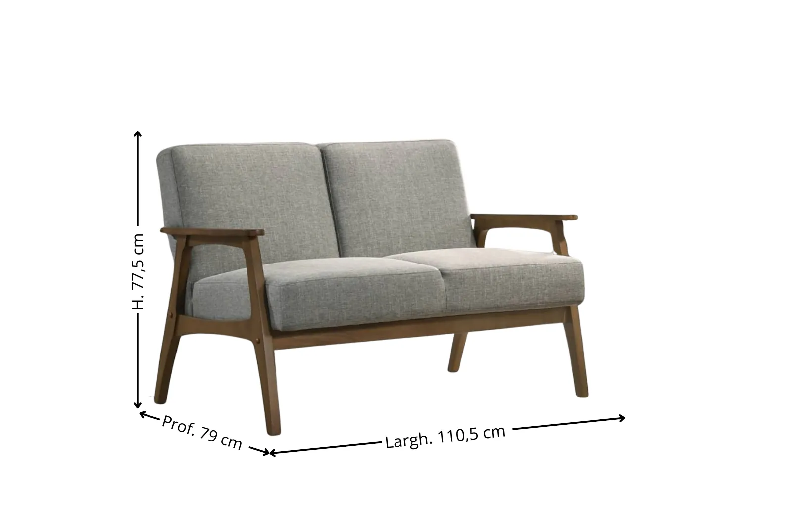 Larghezza 110,5 – Profondità 79 – Altezza 77,5 cm – Altezza schienale 45 cm Seduta: 104 cm