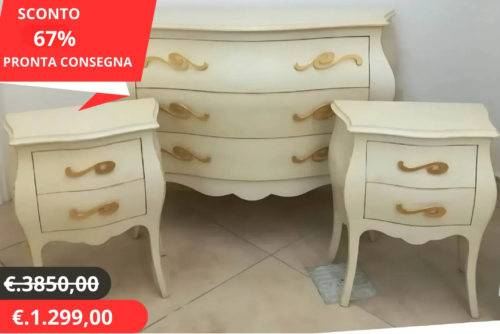 Gruppo comò e comodini bombato Avorio Decapato e Foglia Oro “Pronta Consegna”