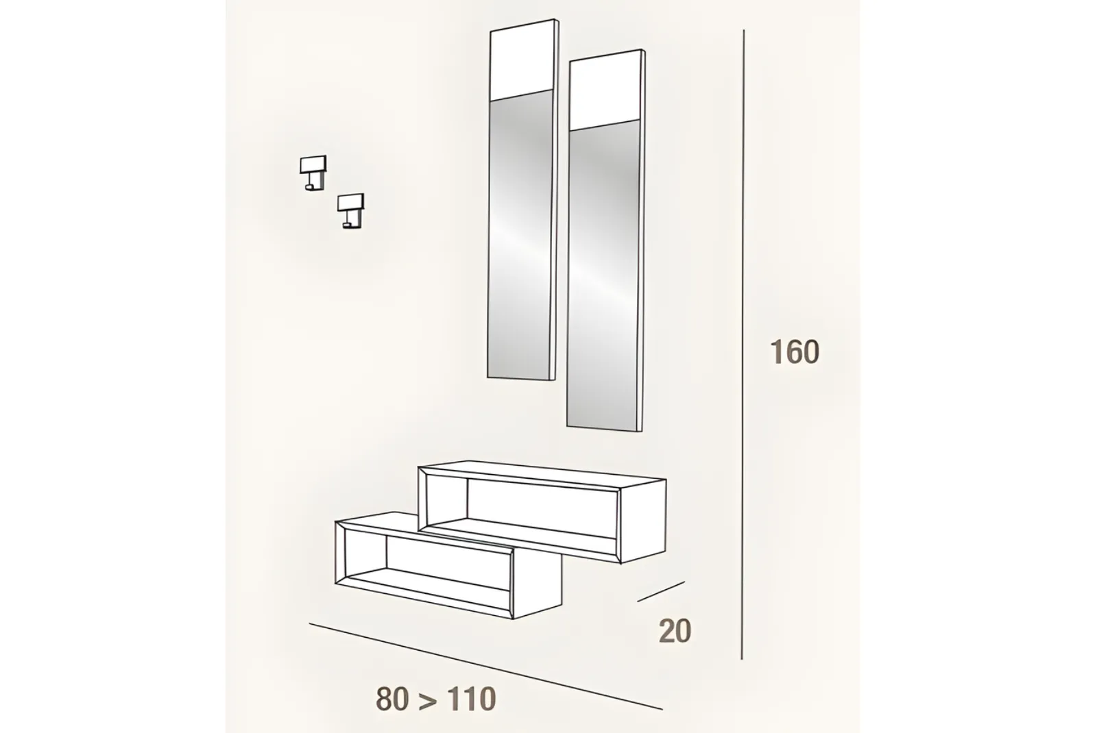 • Dimensioni composizione: Larghezza 110 – Profondità 20 – Altezza 160 cm