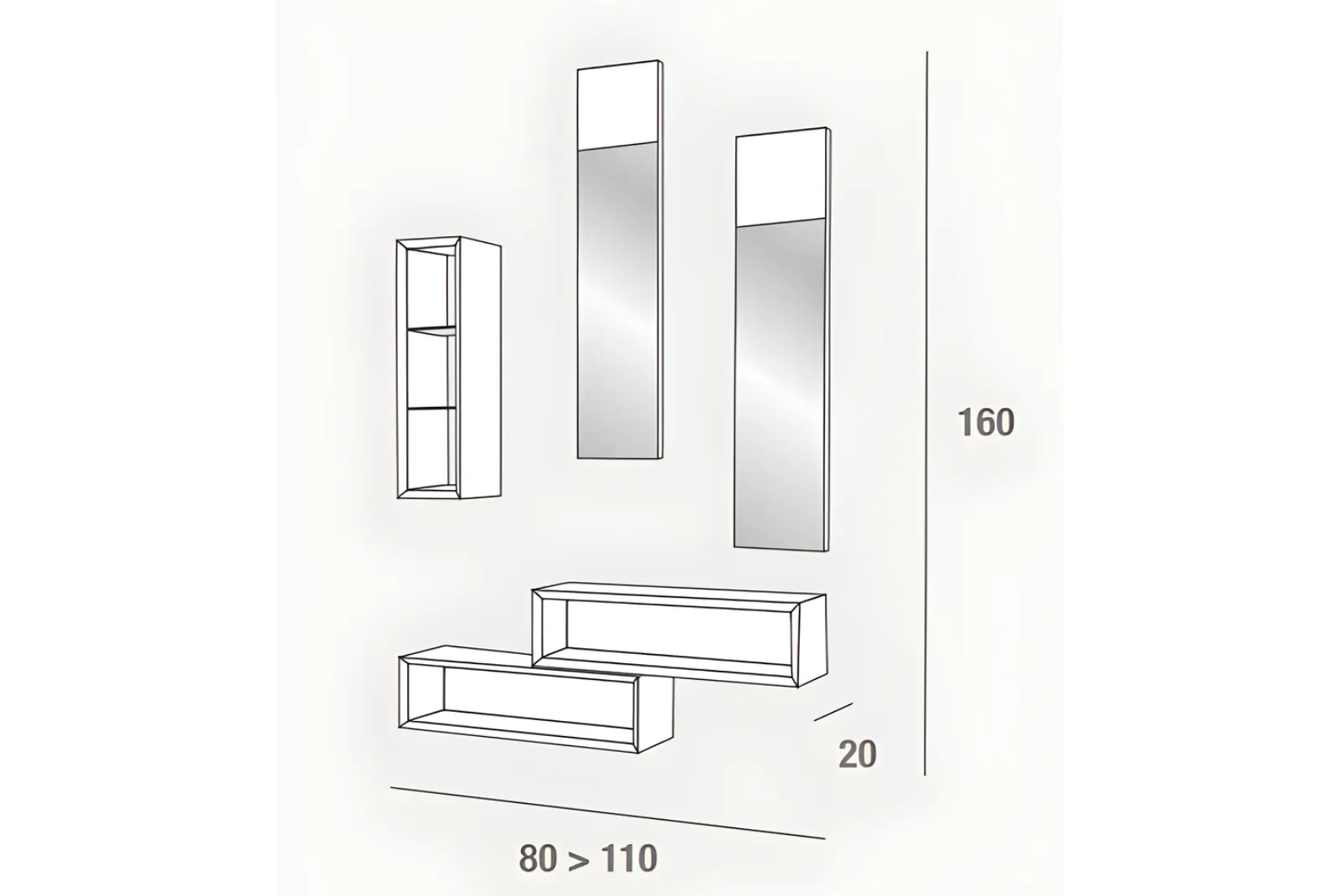 - Dimensioni composizione: L.110 – Prof.20 – H.160 cm