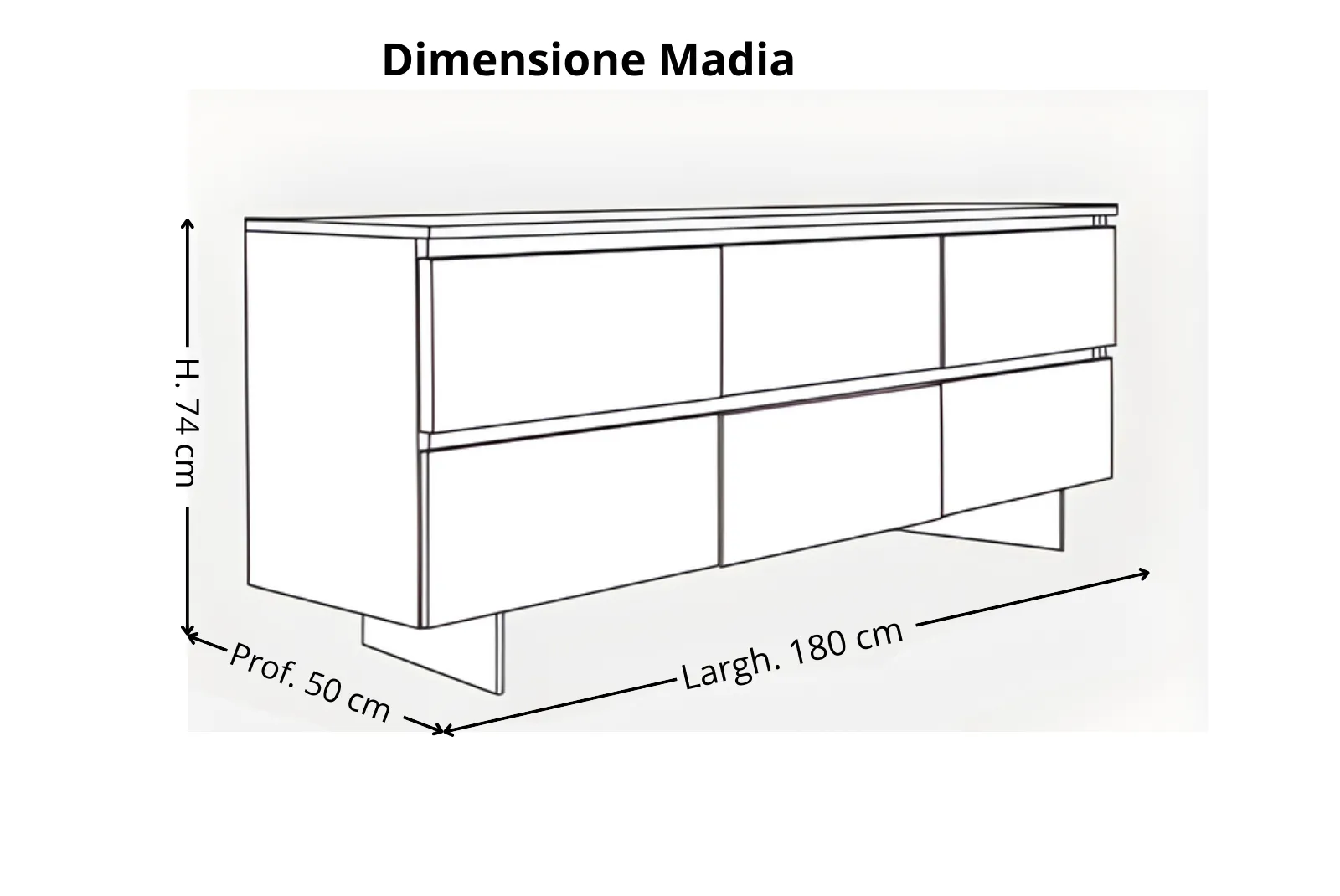 - Dimensioni madia: Larghezza 180 – Profondità 50 – Altezza 74 cm