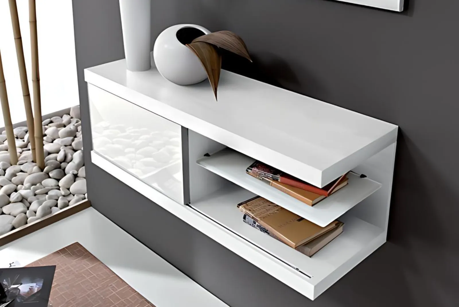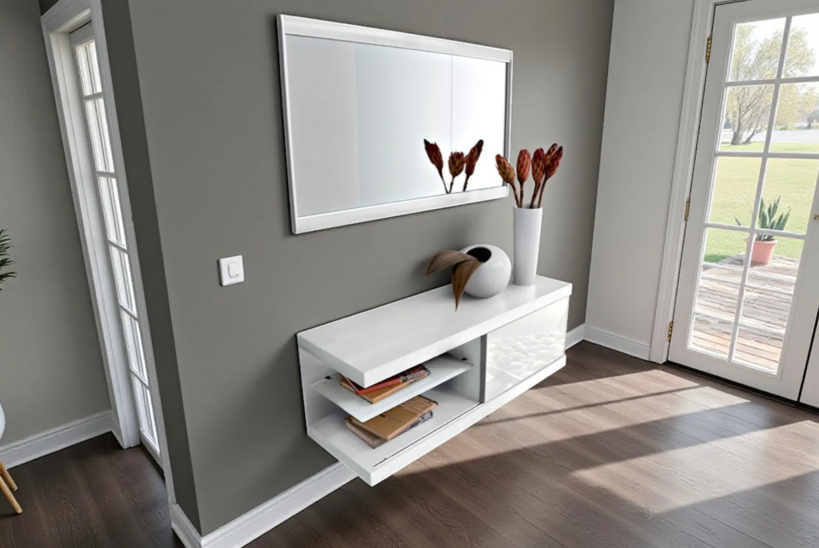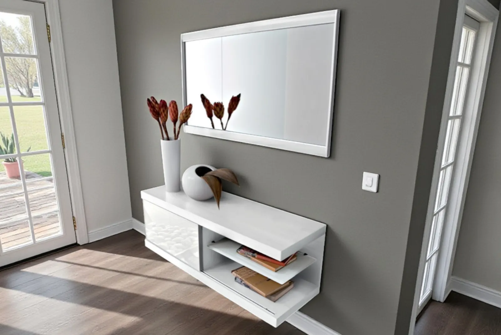 Composta da una consolle sospesa in banco opaco con anta in vetro bianca o colore moka, uno specchio coordinato in finitura bianca e due pratici appendini in alluminio, questa proposta unisce stile e praticità in un design essenziale e raffinato.