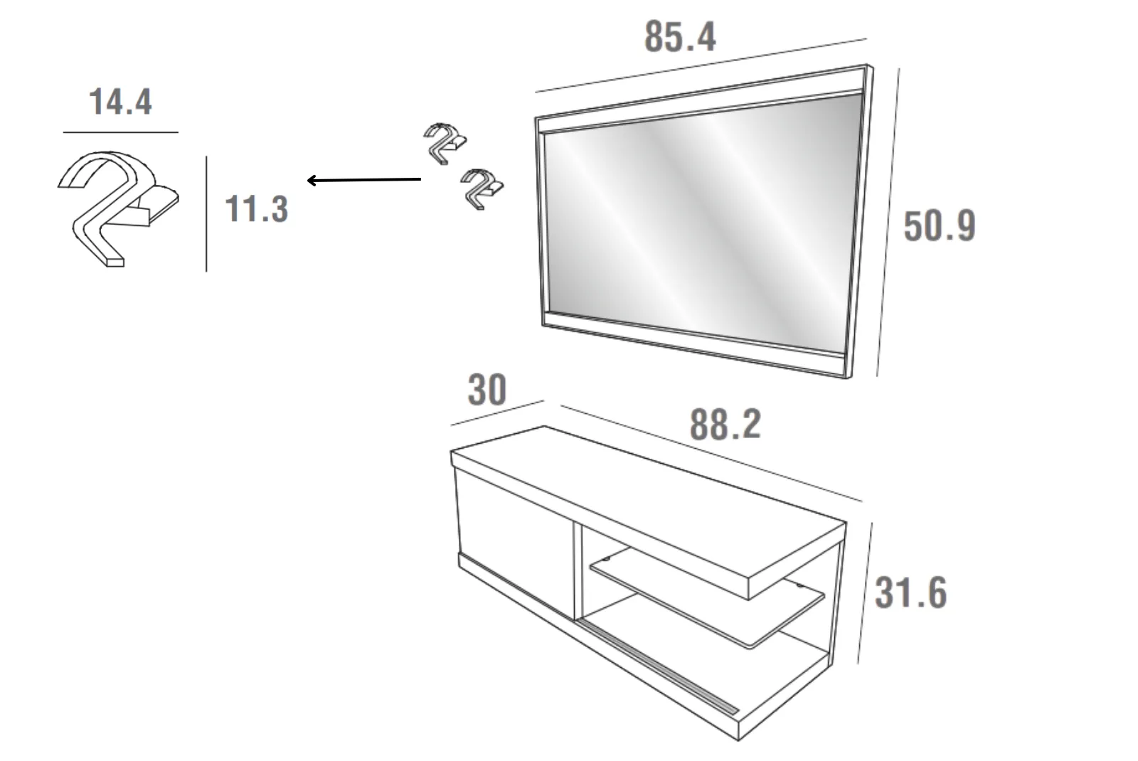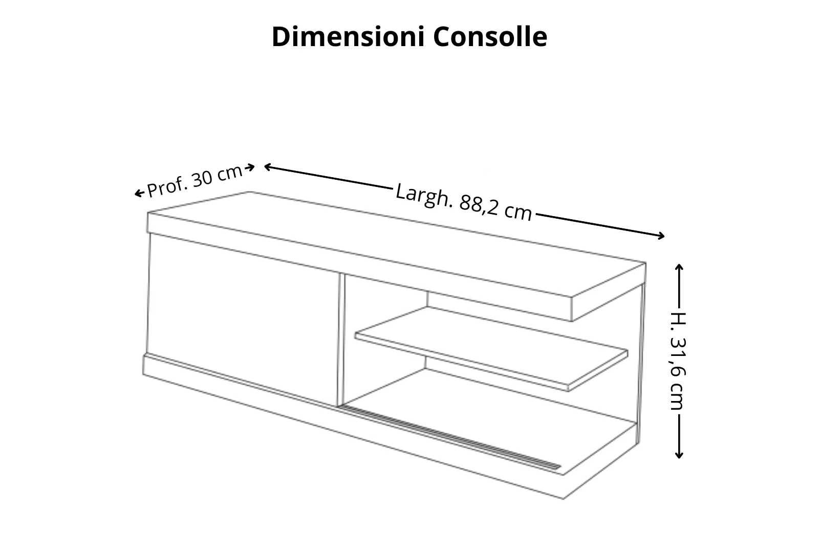 Composizione: L.84,5 – Prof.30 – H.120 cm Consolle: L.88,2 – Prof.30 – H.31,6 cm Specchio: L.50,9 – H.85,4 cm