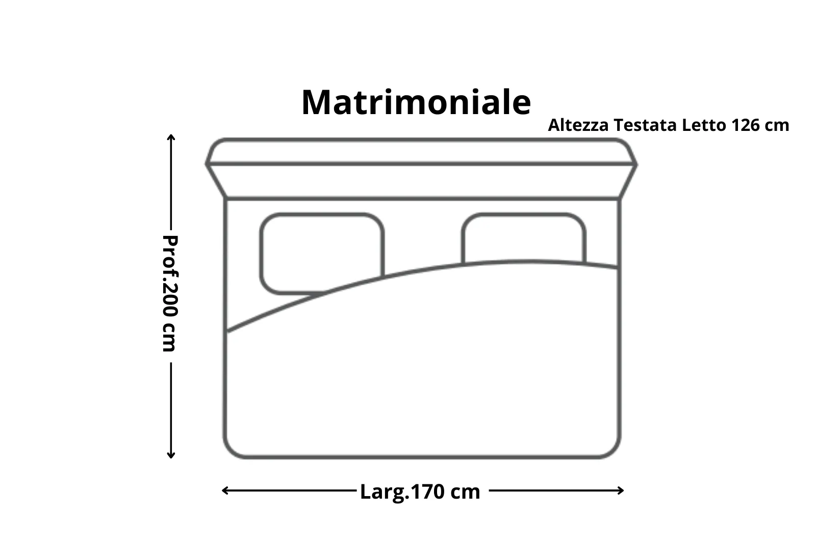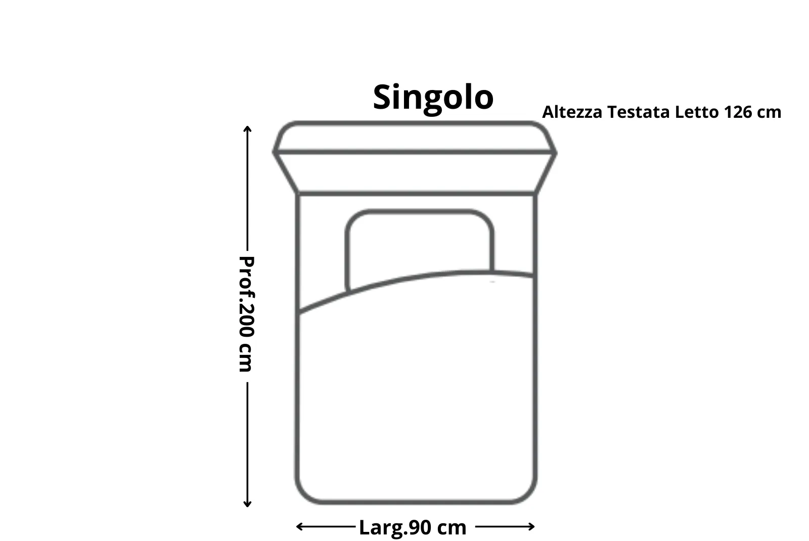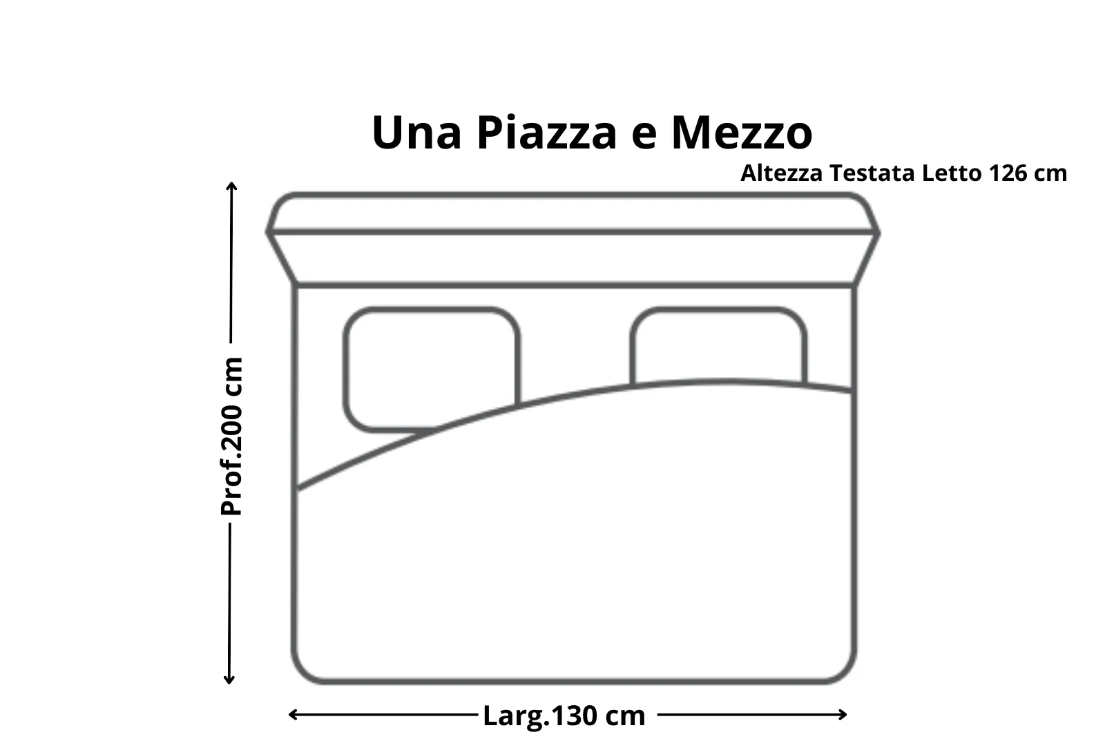 Dimensioni Letto Matrimoniale: Larghezza 170 – Profondità 200 – Altezza Testiera letto 126 cm Dimensioni Letto Una Piazza e Mezzo: Larghezza 130 – Profondità 200 – Altezza Testiera letto 126 cm Dimensioni Letto Singolo Larghezza 90 – Profondità 200 – Altezza Testiera letto 126 cm