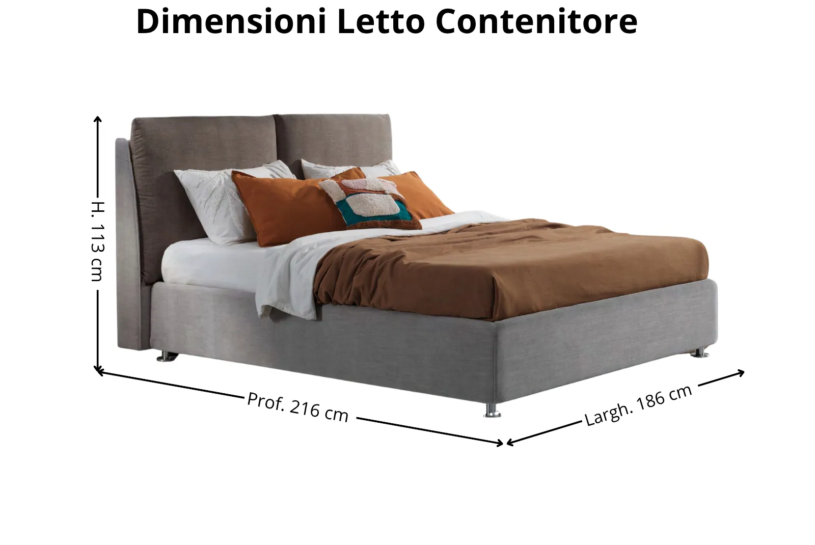 • Dimensioni: Larghezza 186 – Profondità 216 – Altezza testiera 113 cm