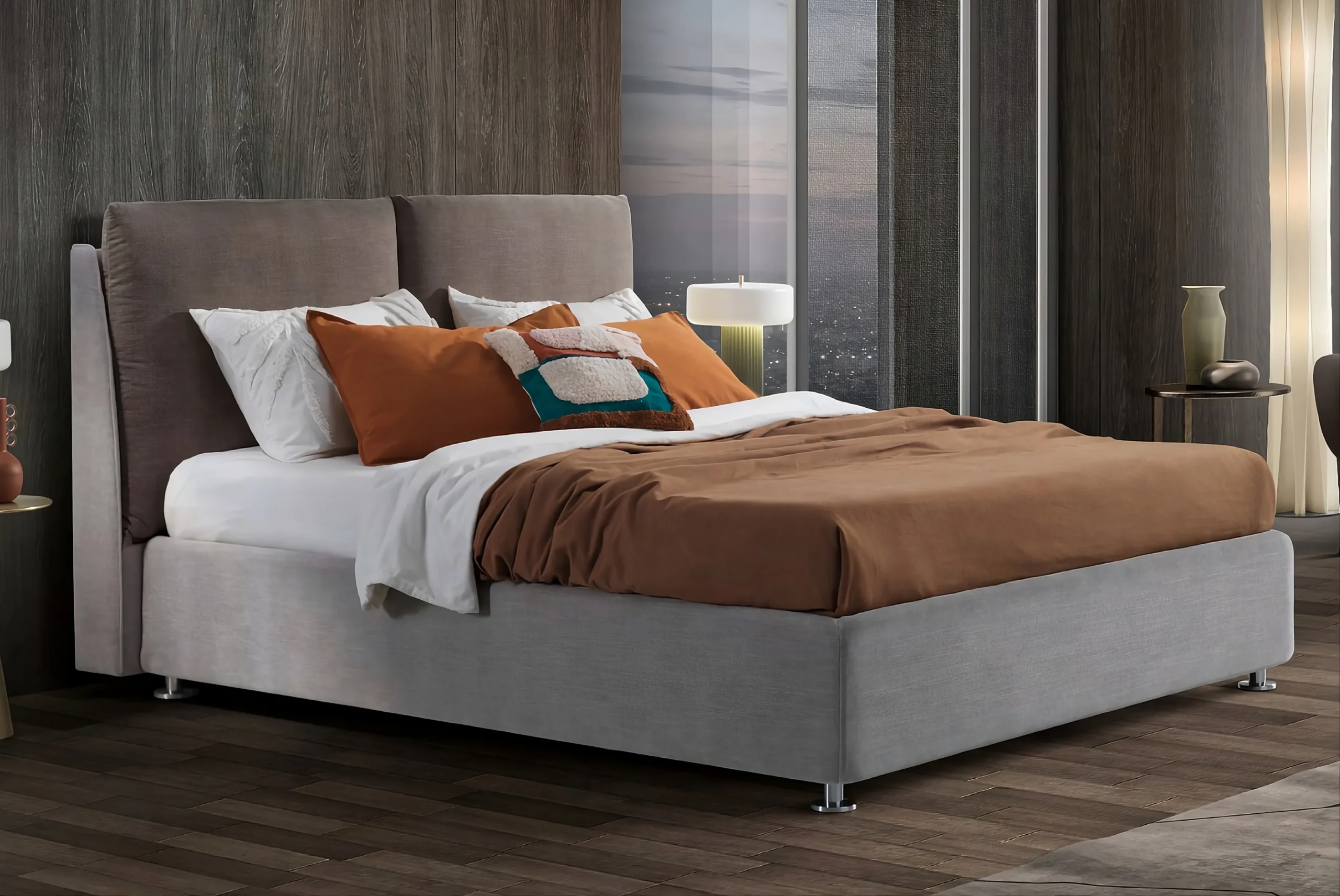 Letto Matrimoniale Comfort con contenitore nel suo stile contemporaneo con testiera sinuosa e morbida, rappresenta un superbo sodalizio di eleganza e suggestione, coronato grazie a una serie di accorgimenti stilistici ambiziosi e dal deciso gusto estetico, e garantisce al tempo stesso una straordinaria comodità.