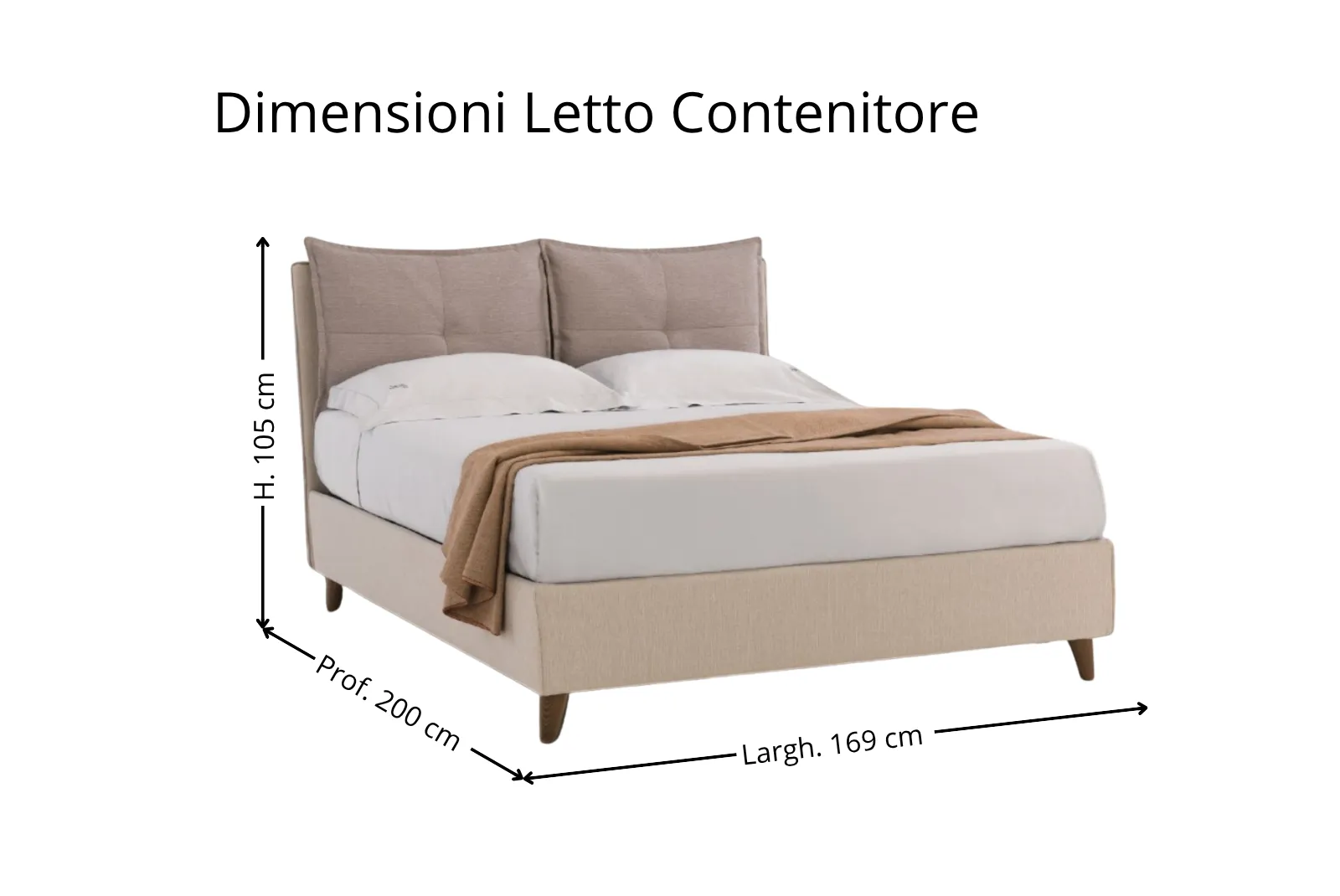 - Dimensioni: Larghezza 169 – Profondità 200 – Altezza testiera 105 cm