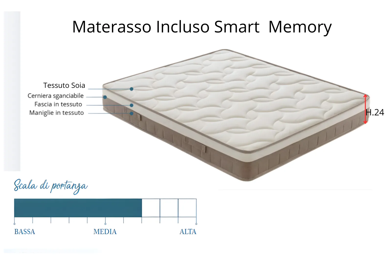 • Materasso: Incluso – Smart Memory L.160 x P.190 Altezza 24 cm