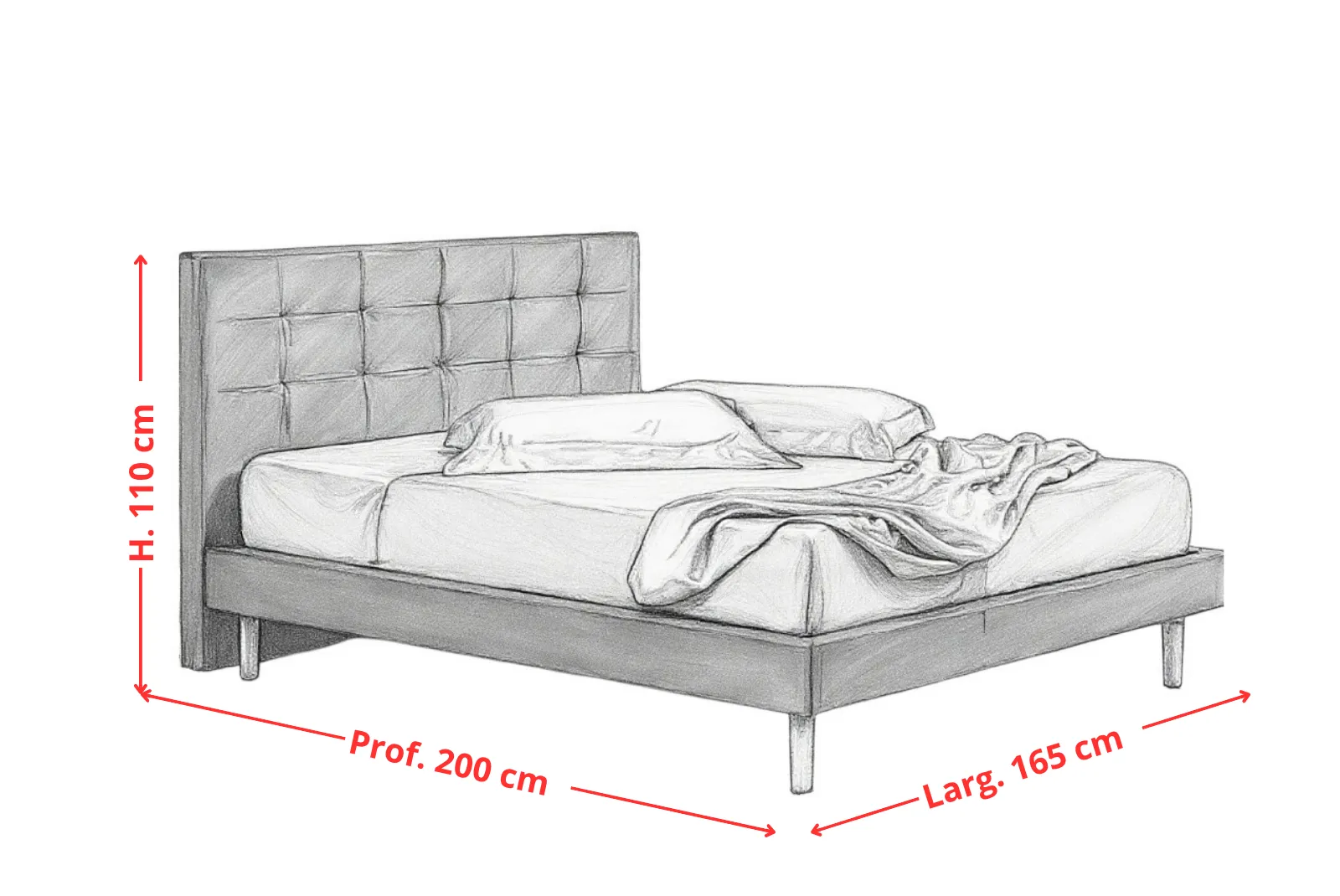 • Dimensioni letto: Larghezza 165 – Profondità 200 – Altezza testata Letto 110 cm