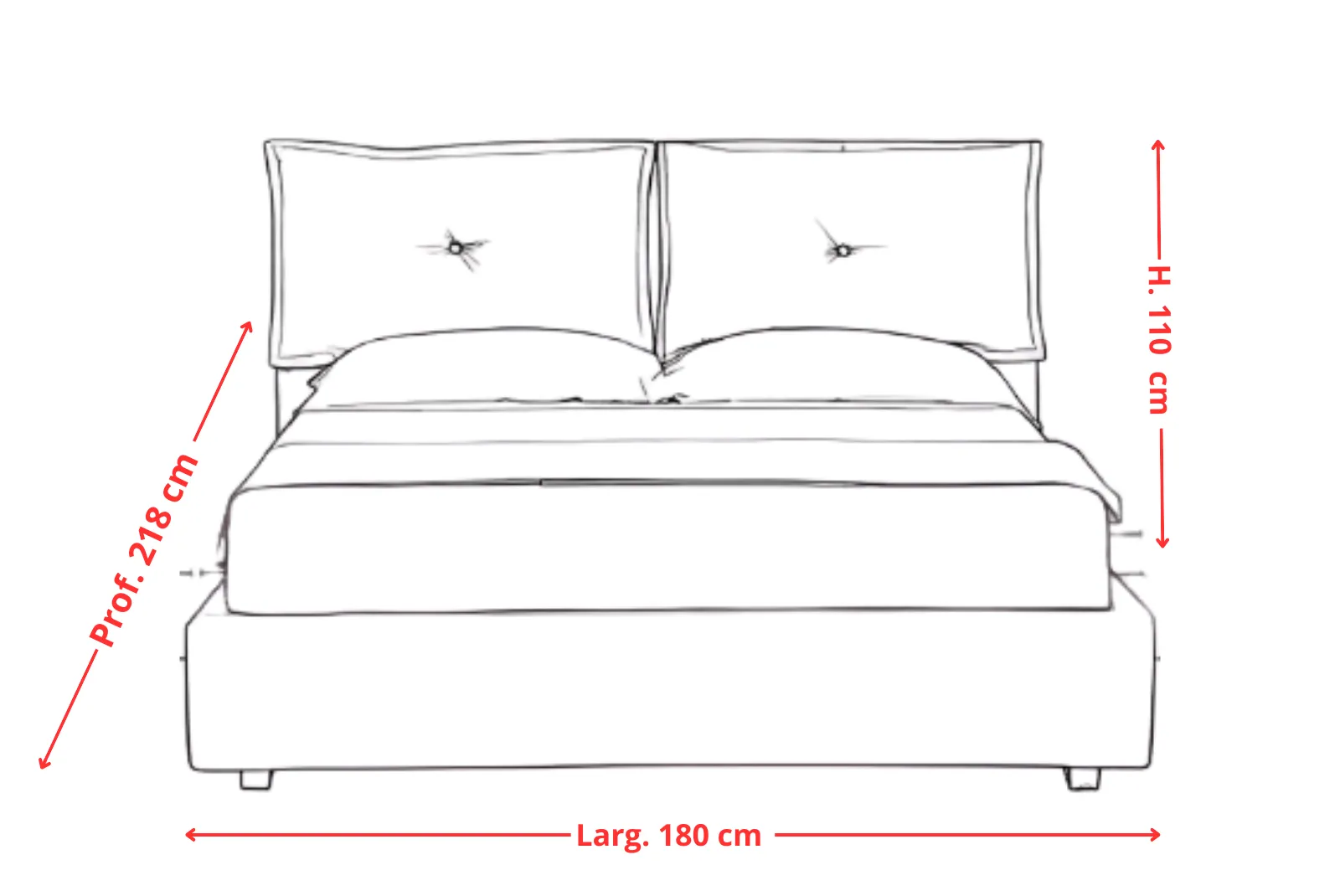 • Dimensioni letto: Larghezza 180 – Profondità 218 – Altezza Testiera Letto 110 cm