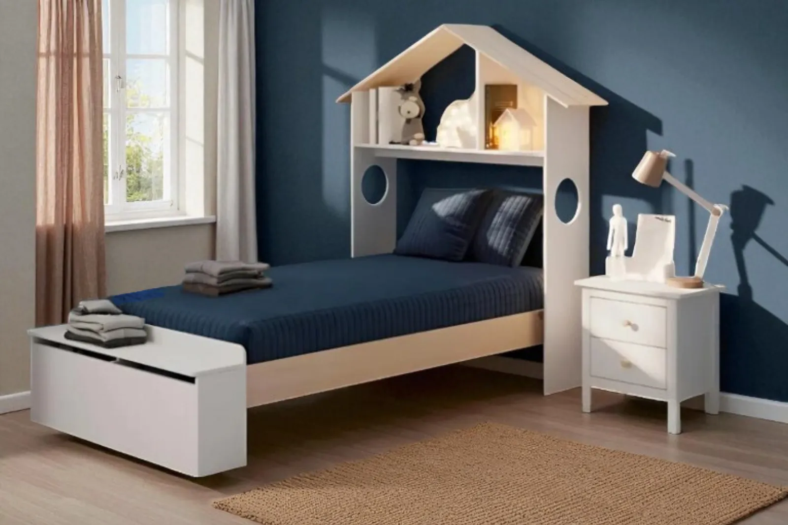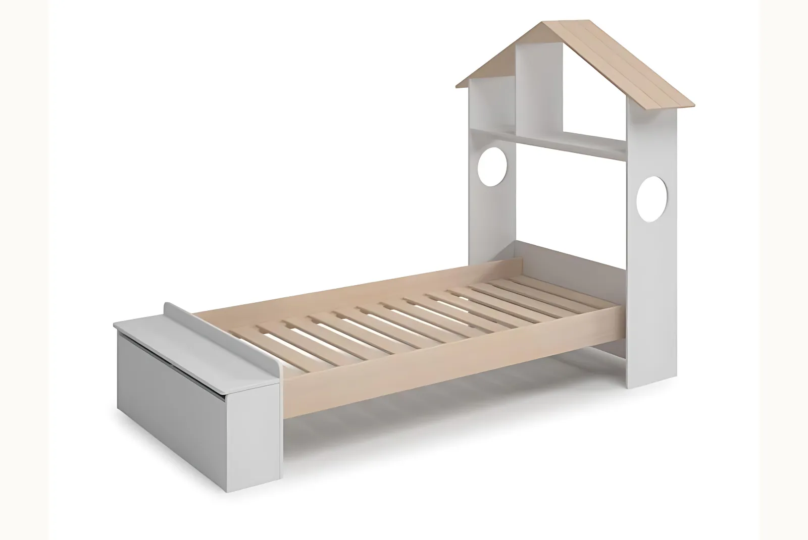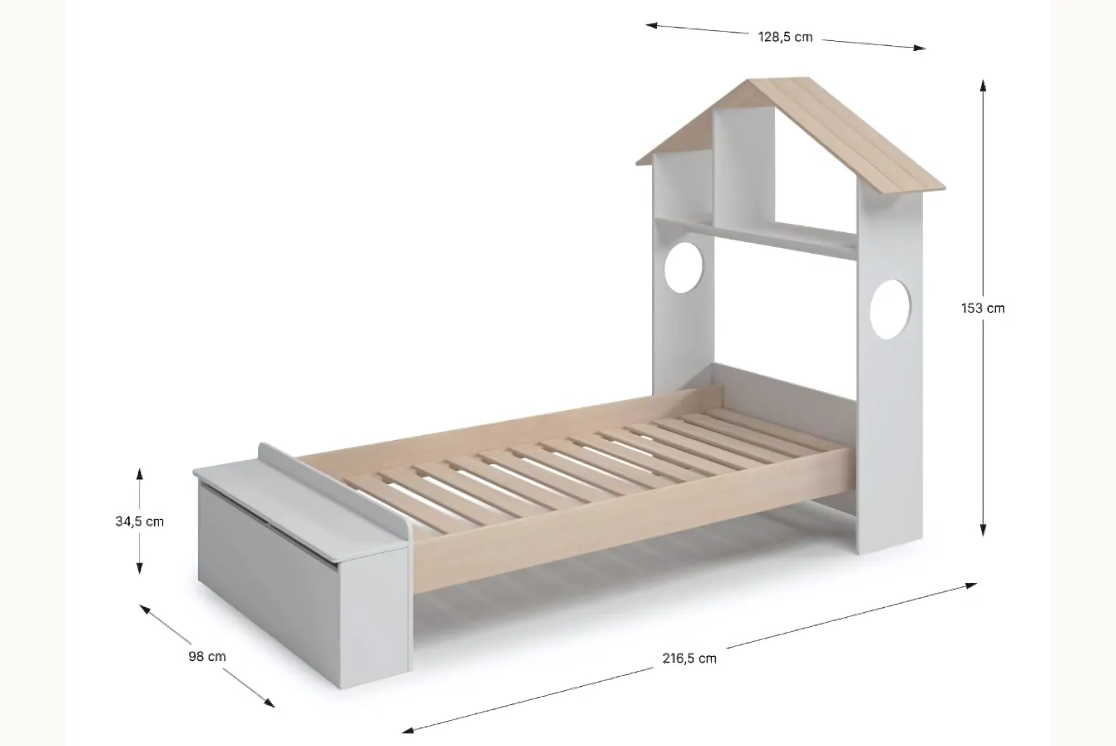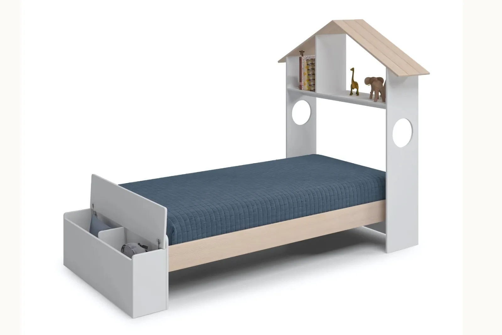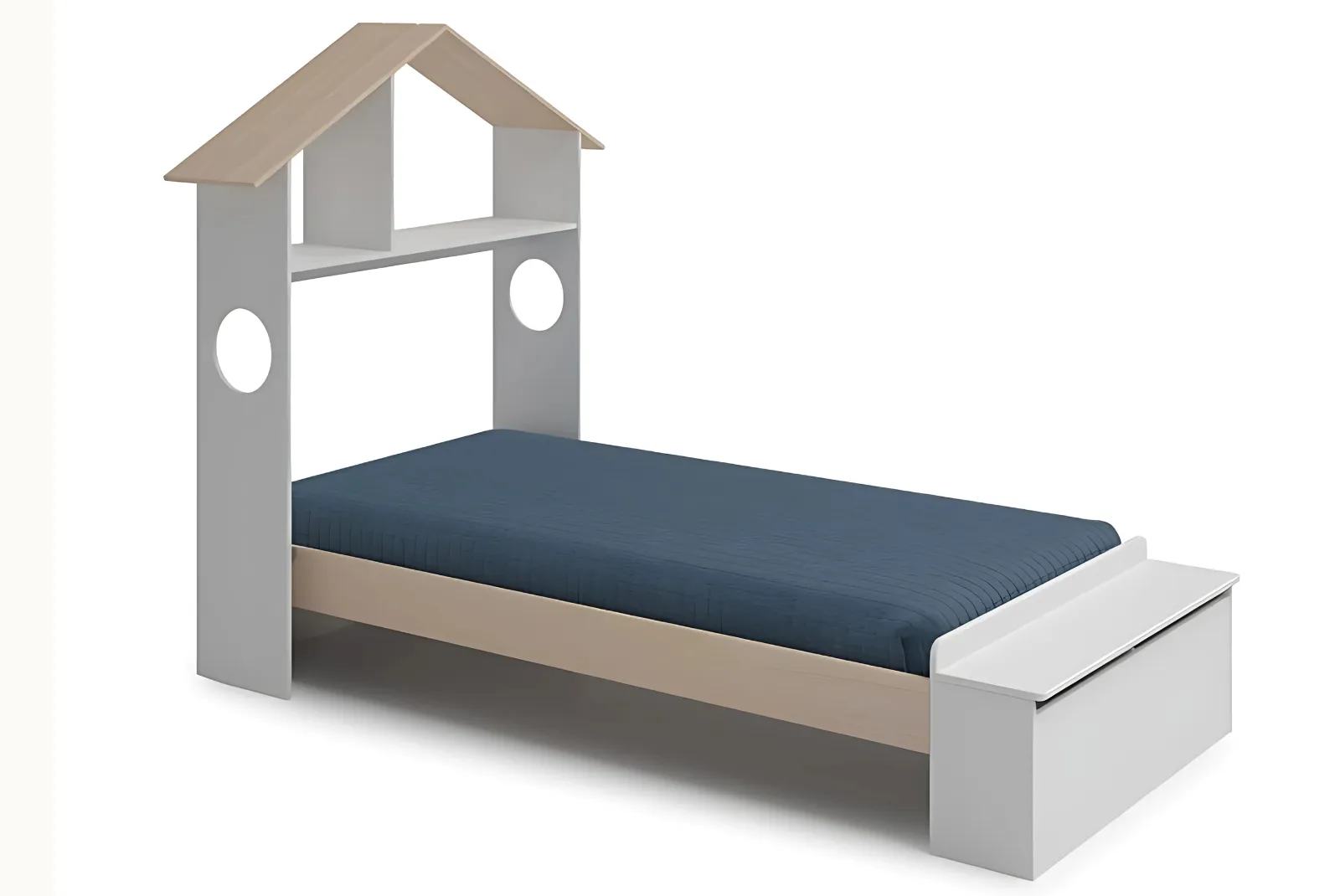 • Struttura: Testiera a forma di casetta, pediera contenitore – materiale MDF/ Pino