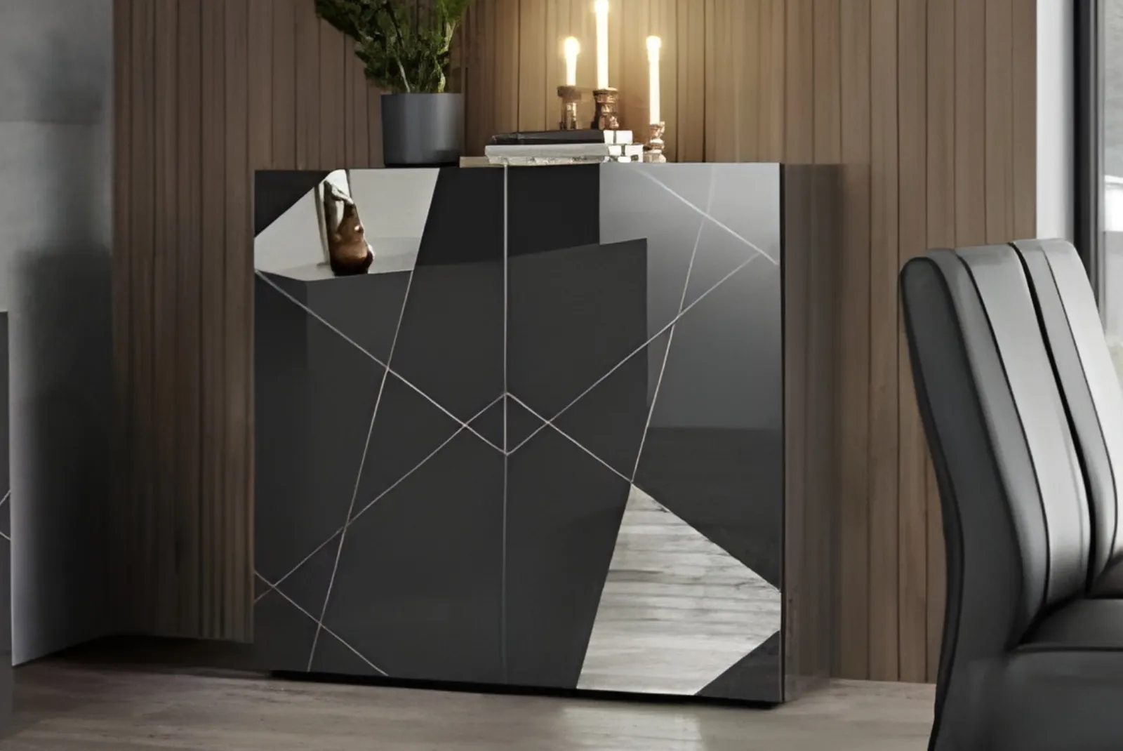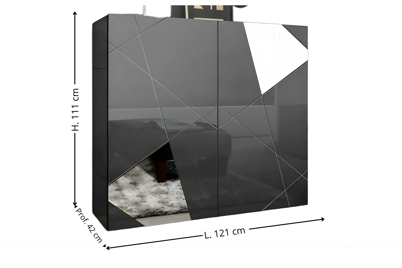 - Struttura e finitura: Grigio lucido e serigrafie con specchi