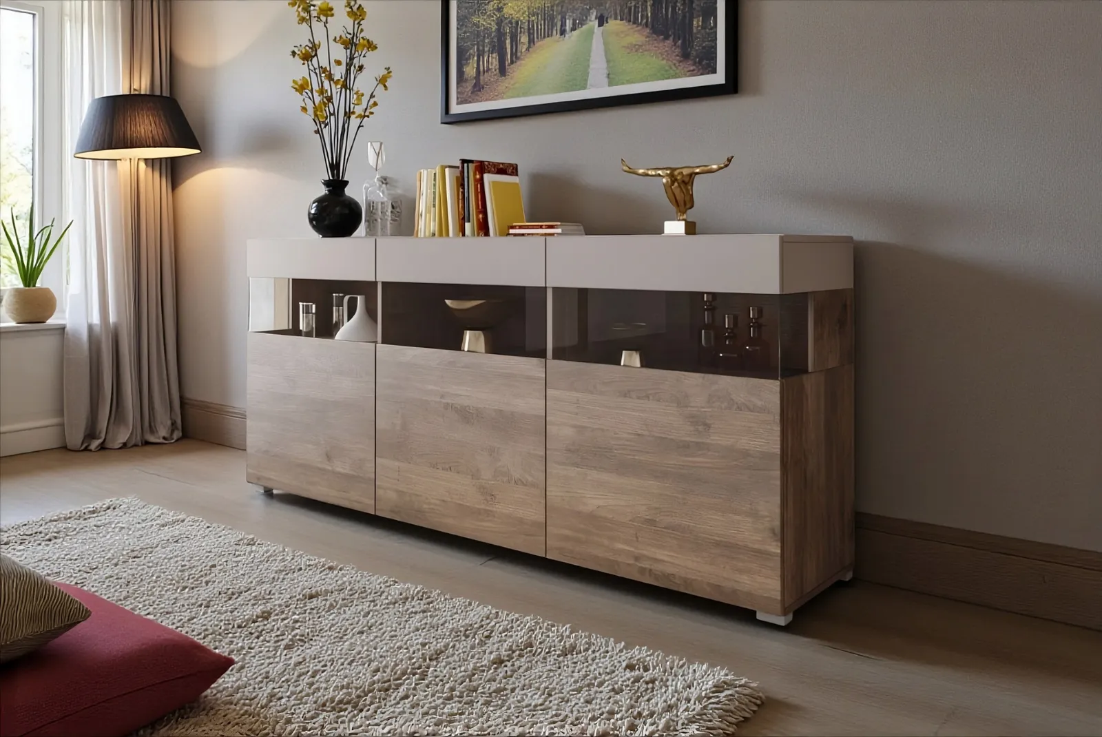 La nostra madia è anche incredibilmente funzionale. Offre ampio spazio per riporre stoviglie, biancheria, libri e altri oggetti. Le ante e i cassetti sono dotati di meccanismi di apertura e chiusura morbidi e silenziosi, per un utilizzo confortevole e senza sforzo.